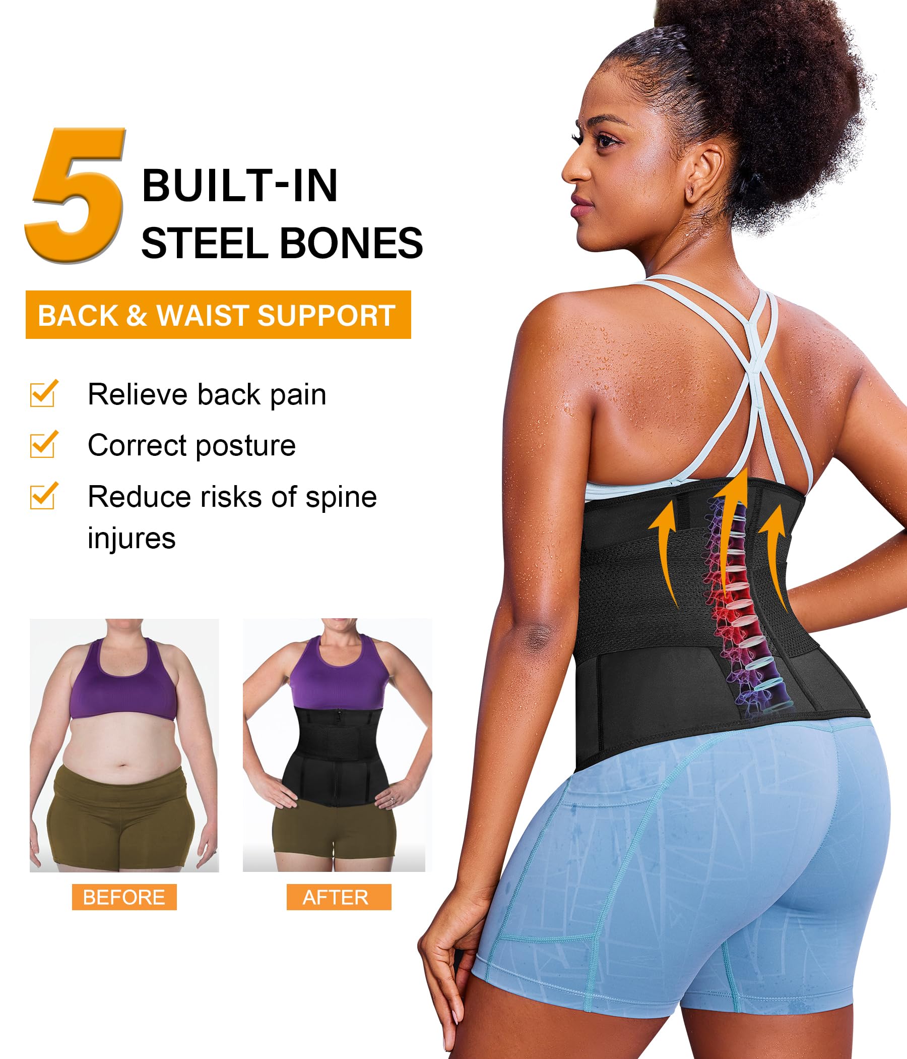 - BACK SUPPORT and RELIEVE PAIN. Sweat waist trimmer for women belly fat wrap is designed with bult in 5 steel bones一360 degree aroundinfg our waist, which can bend and recovery quickly, avoid to moving during wearing. Women corset waist trainer sweat bands extra support our waist and back to protect our spine and reducing back pain. Especially when exercising and sitting to work for a long time. Workout waist cincher belts improve posture to prevent from muscle strain and lumbar disc herniation.