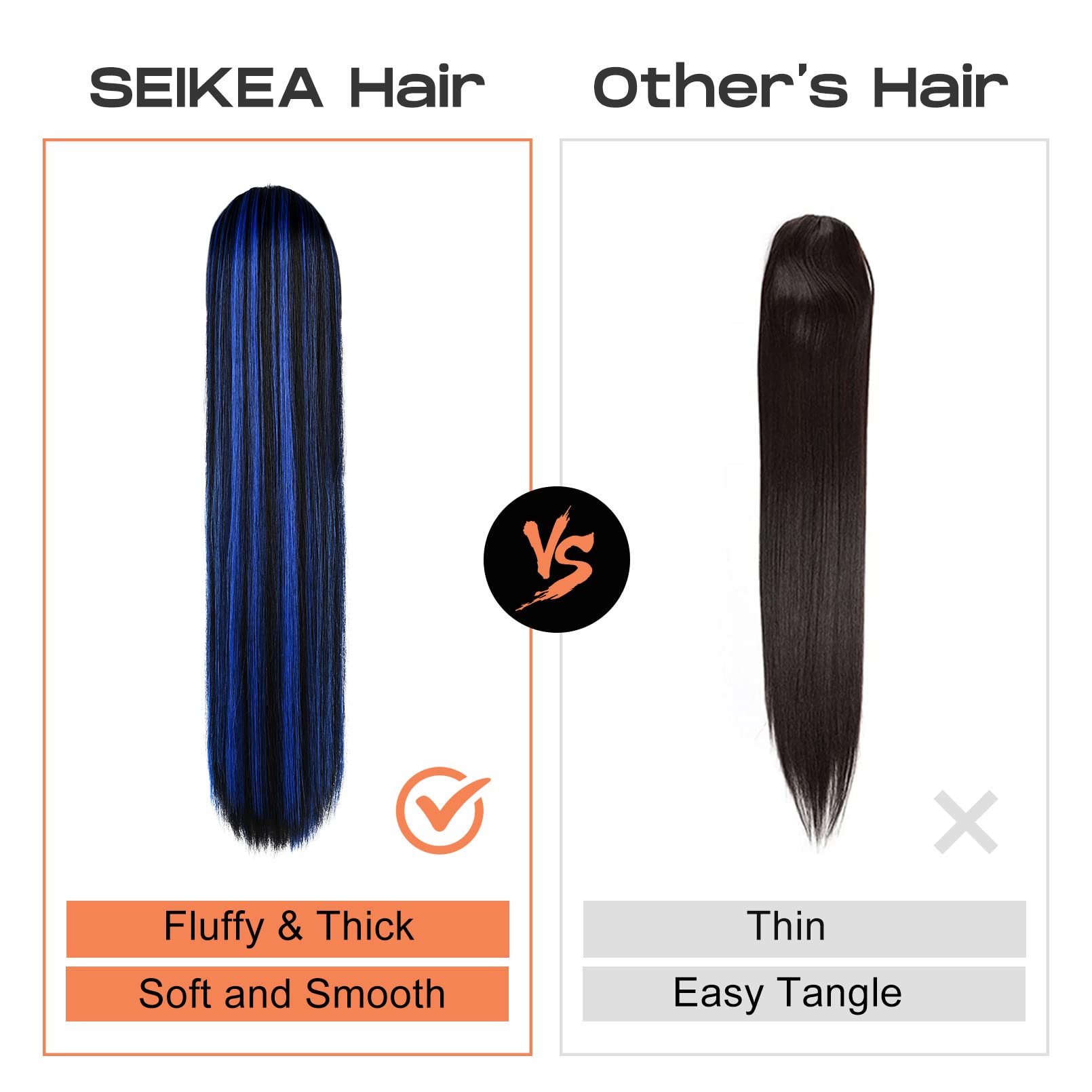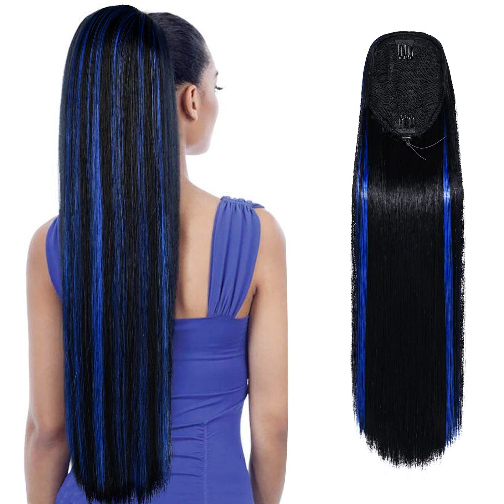 SEIKEA Ponytail Extensions Drawstring Long Straight Fake Pony Tail Natural Soft Clip in Hair Extension Synthetic Heat Resistant Hairpiece 28 Inch Natural Black with Blue Highlights