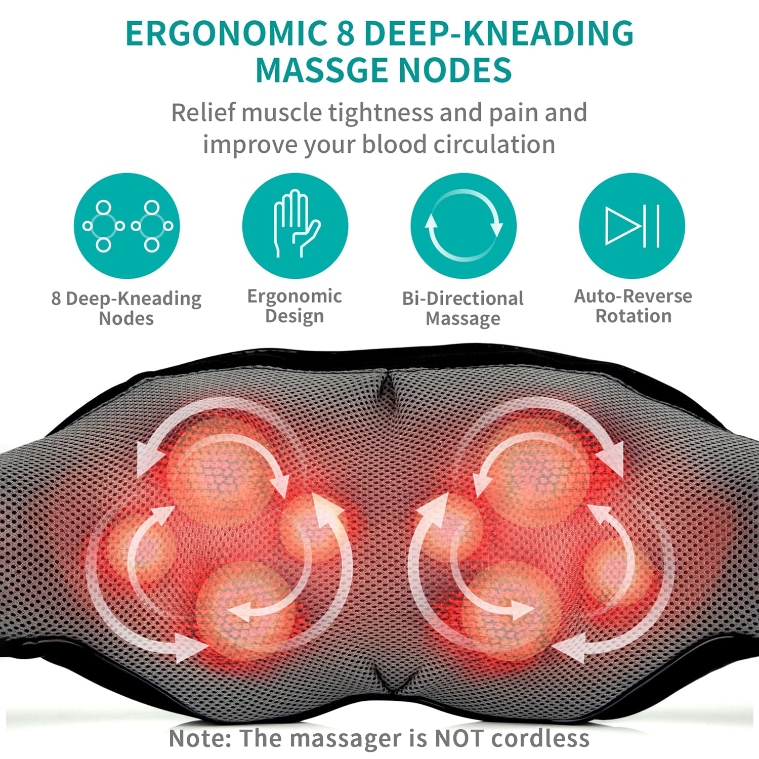 - 8 Powerful Deep-Shiatsu Kneading Massage Nodes. Our neck massager help you better with alleviate muscle soreness, ease neck stiffness, eliminate cervical fatigue, and relax yourself after a long day work