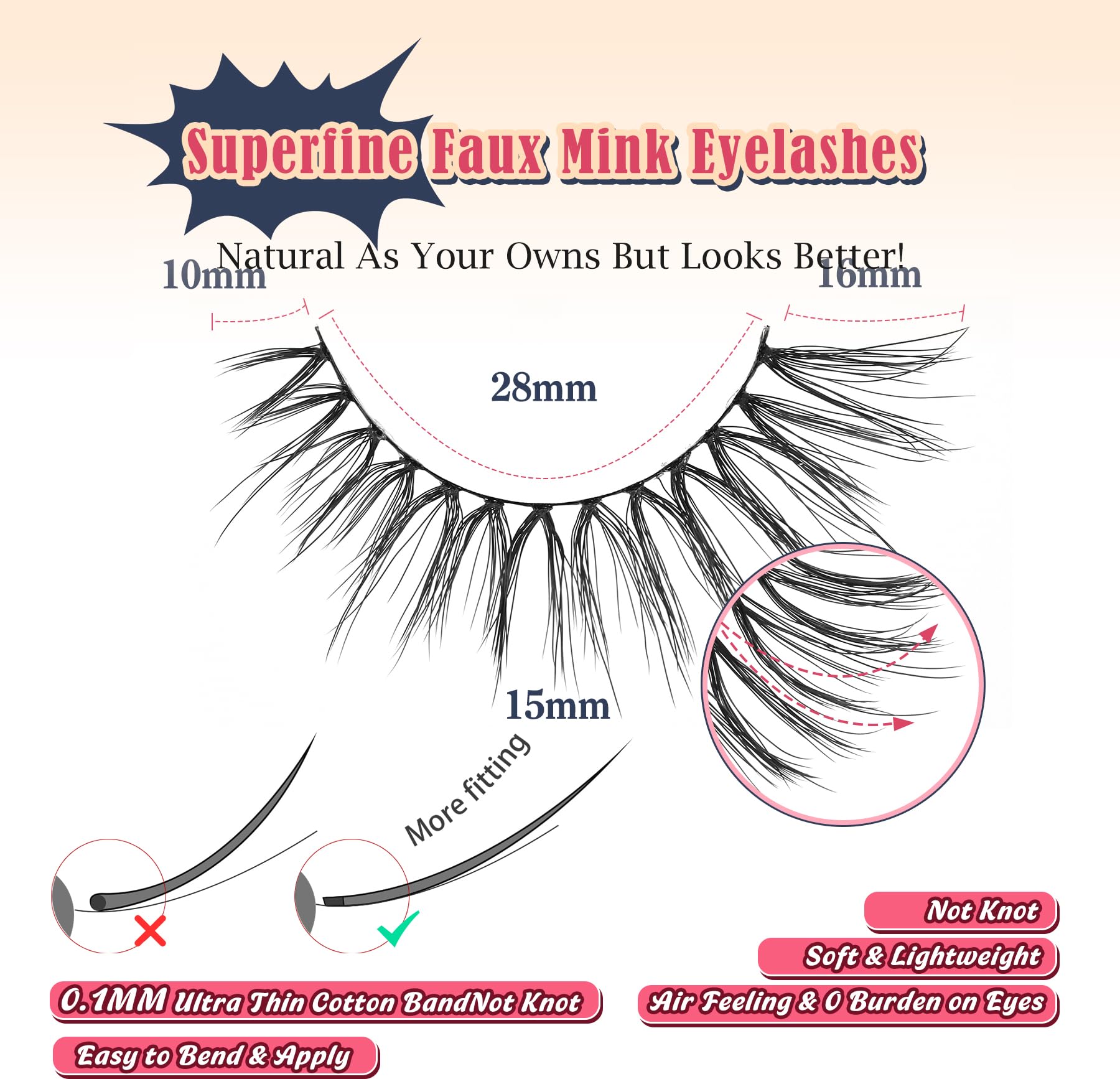 - THIN FLAT BAND STRIP LASHES: The wispy eyelashes use 0.1mm thin flat cotton black band, seamlessly blend to your real eye lashes for a natural make up look. Apply in a minute, perfectly suit for DAY-TO-DAY use, vacation party or date and all of age