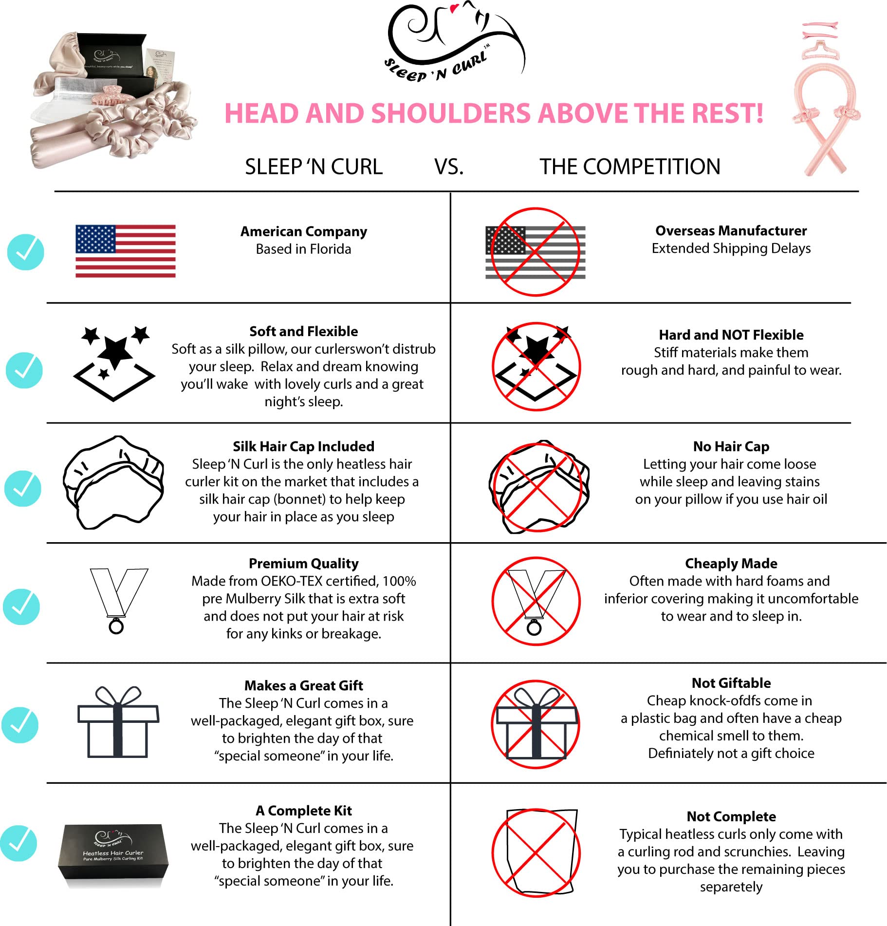 - ✅♡ HEATLESS CURLS = ZERO DAMAGE: The Sleep 'N Curl heatless curler set delivers impeccable curls without putting your hair at risk from heat damage. Pamper yourself and get the salon-styled hair you always wanted. The Sleep ‘N Curl will give you effortless waves, curls, or glamorous loose waves without the heat damage from hairdryers or curling irons.