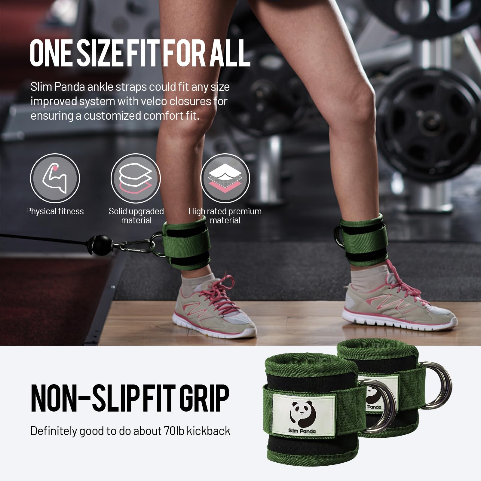 Slim Panda Ankle Strap for Cable Machine,Ankle Cuff for Kickbacks, Booty Hip Abductors,Glute Workouts, Leg Extensions, Curls for Men and Women, Adjustable with Double D-Rings (Pair, Green)