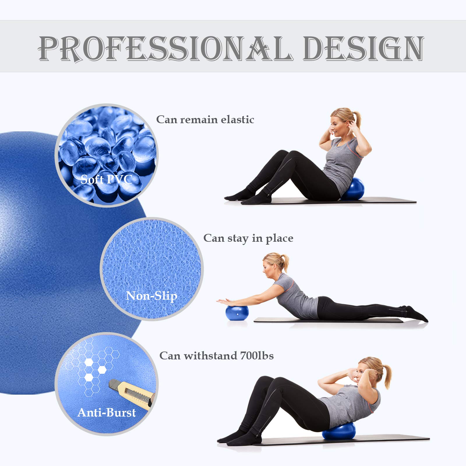 - PROFESSIONAL DESIGN - Made of soft, flexible, durable and skin-friendly PVC, can remain elastic and squishy even fully inflated. Special film attached to the surface, make Goonidy Pilates Ball smooth but non-slip, and can withstand 700lbs, not burst even if pierced by a sharp object.