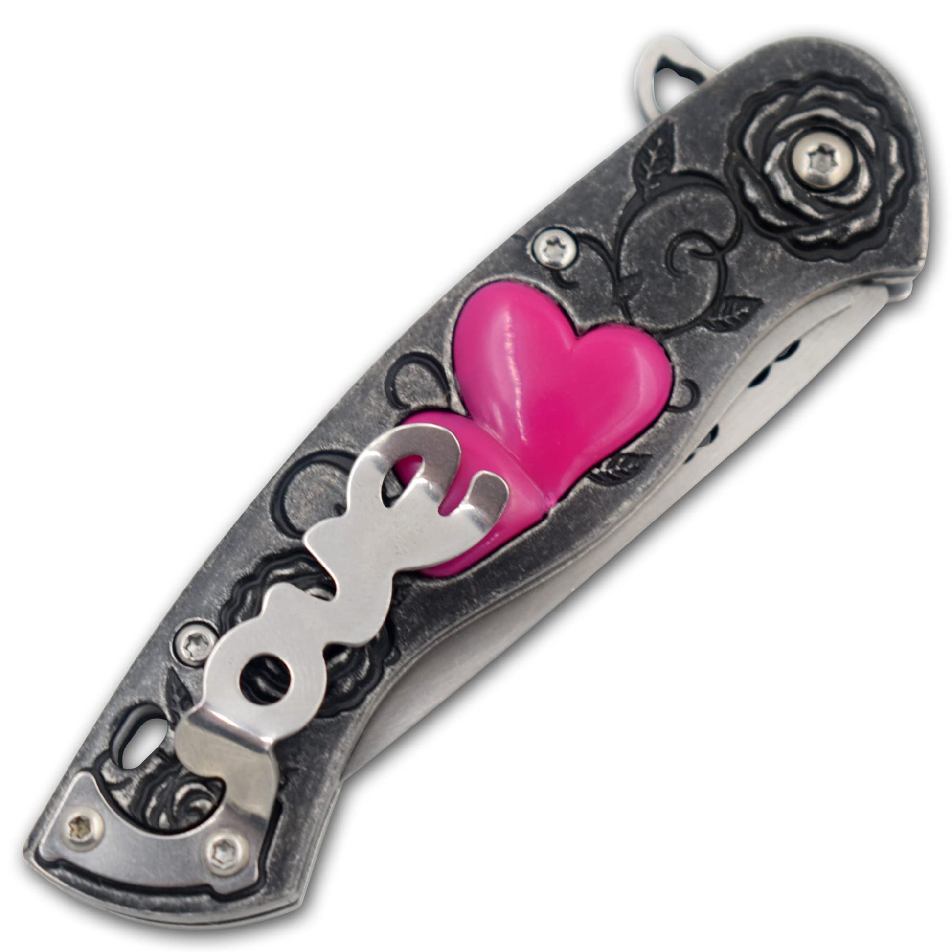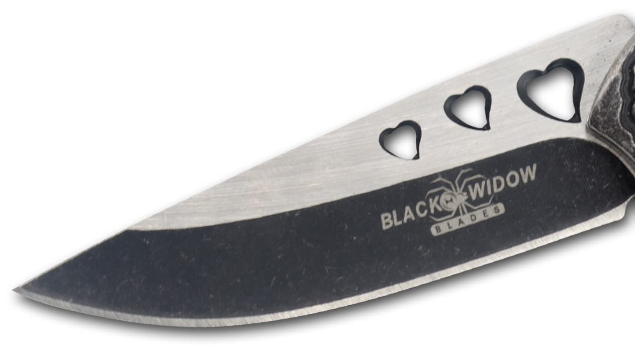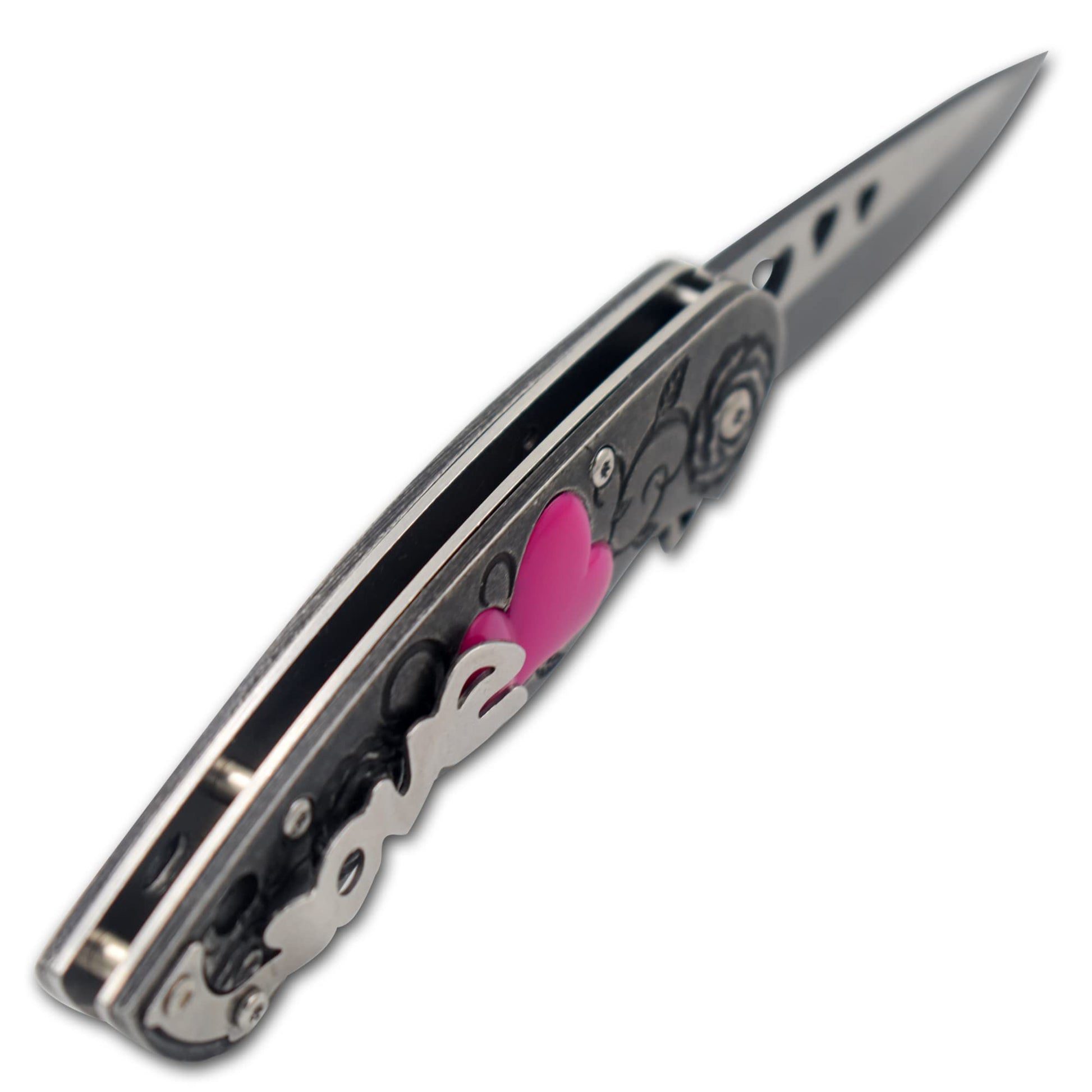Details: Snake Eye Tactical Cupid Heart Ladies Pocket Knife 7-Inches oveall length of knife when opened 3-Inches Drop Point 3CR13 Steel Two Tone Love Engraved Blade 4- Inches Cupid Heart Crafted Metal Handle LOVE Pocket Clip on Back