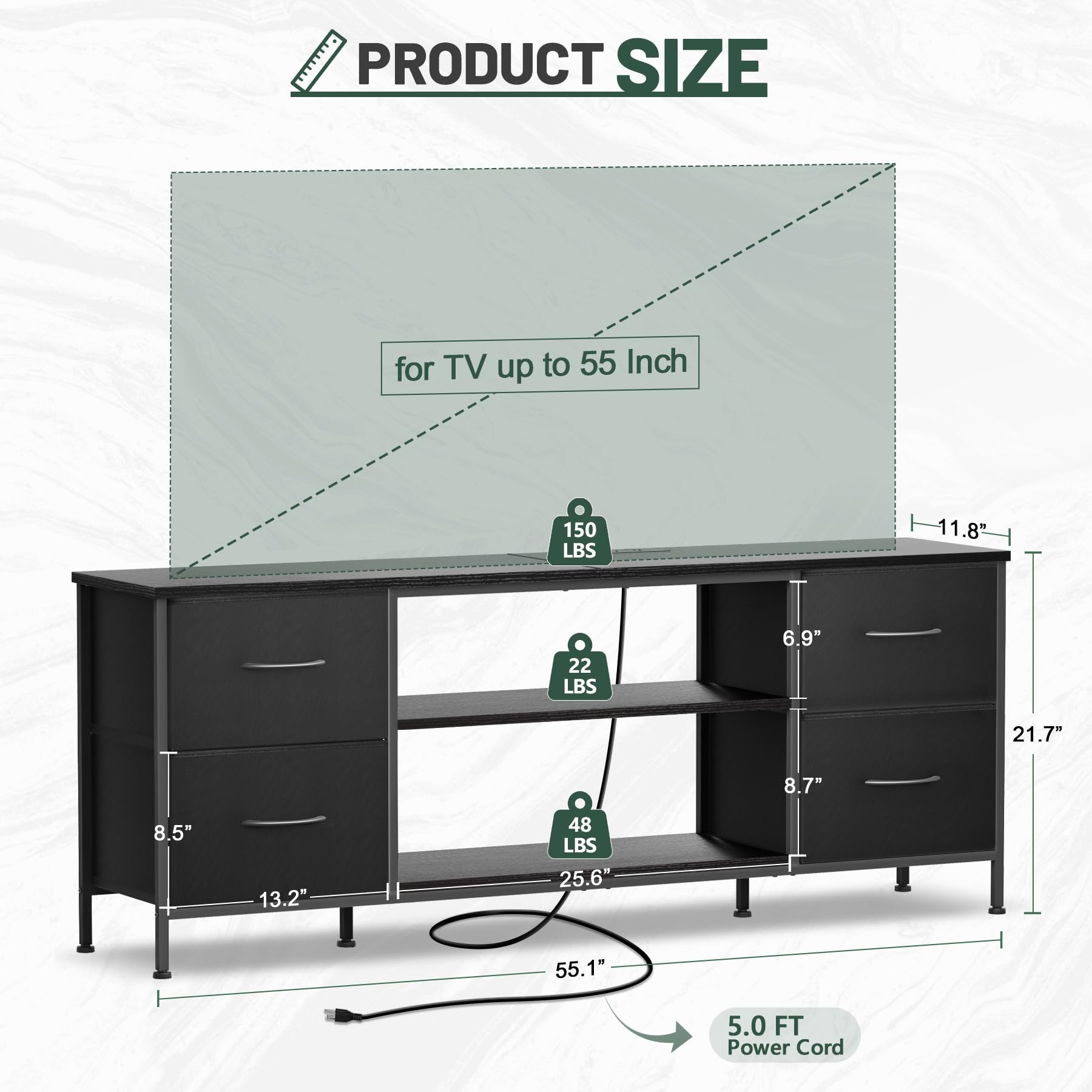 - Dimension - The tv stand dimensions: 55.1'L x 11.8'W x 21.7'H, which is ideal for TV up to 55 inch. Fabric drawer dimensions: 13.2' L x 11.8'W x 8.5' H. This tv stand for bedroom comes with detailed instructions and all hardware needed, it is easy to assemble.