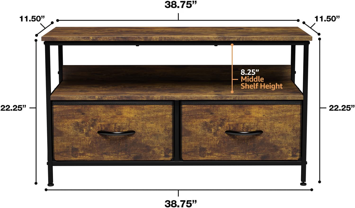 - SMART & STYLISH DESIGN — Sleek wide storage — Made with strong steel frame and durable MDF wood top with smooth finish — Drawers made of breathable, non-woven fabric — Wipe clean — Minimal assembly required — Hardware and instructions INCLUDED — Middle Shelf 8.25” H— Entire Unit Approximately 38.75” L x 11.50” W x 22.25” H Drawers measure 18.11 x 11 x 8.46 in