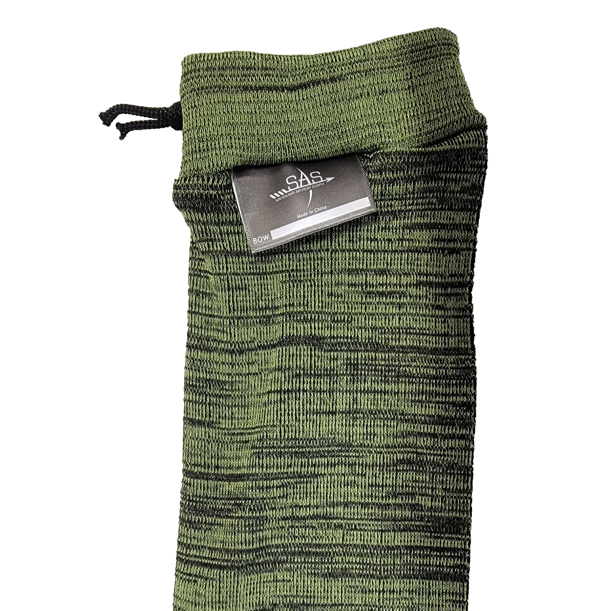 Details: Protect your traditional bow from moisture and dust with SAS soft sock sleeve bag. Features: Thick and Soft Stretchable fabric will easily fit your bow Drawstring Closure allows you to tighten the bow sock for secure storage or travel 4.5' Wide