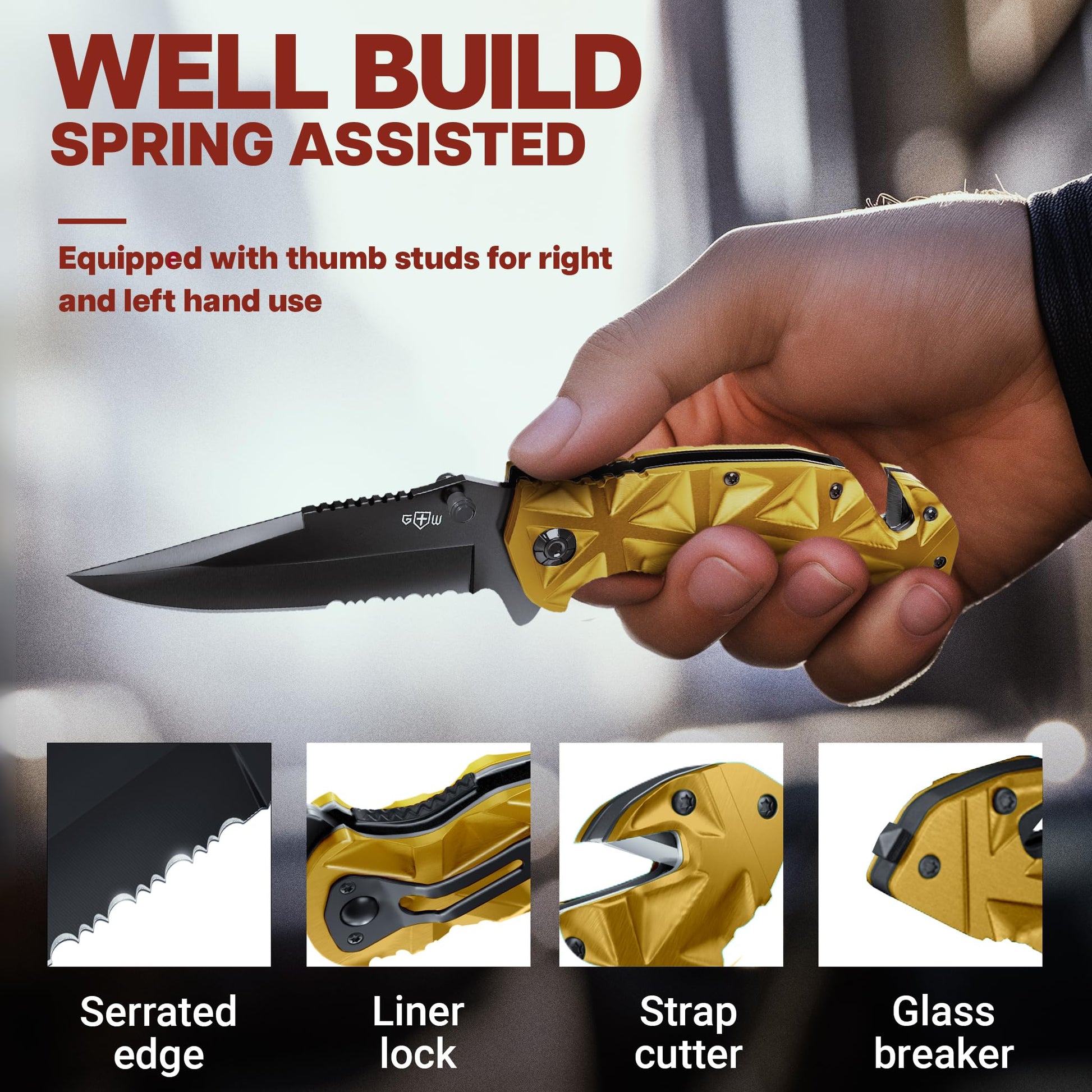 Spring Assisted Knife for Men & Women - Bronze Pocket Knife with Serrated Blade Glass Breaker Seatbelt Cutter - Cool Folding Knives for Camping Work EDC - Best Gift Ideas for Him and Her 207 G