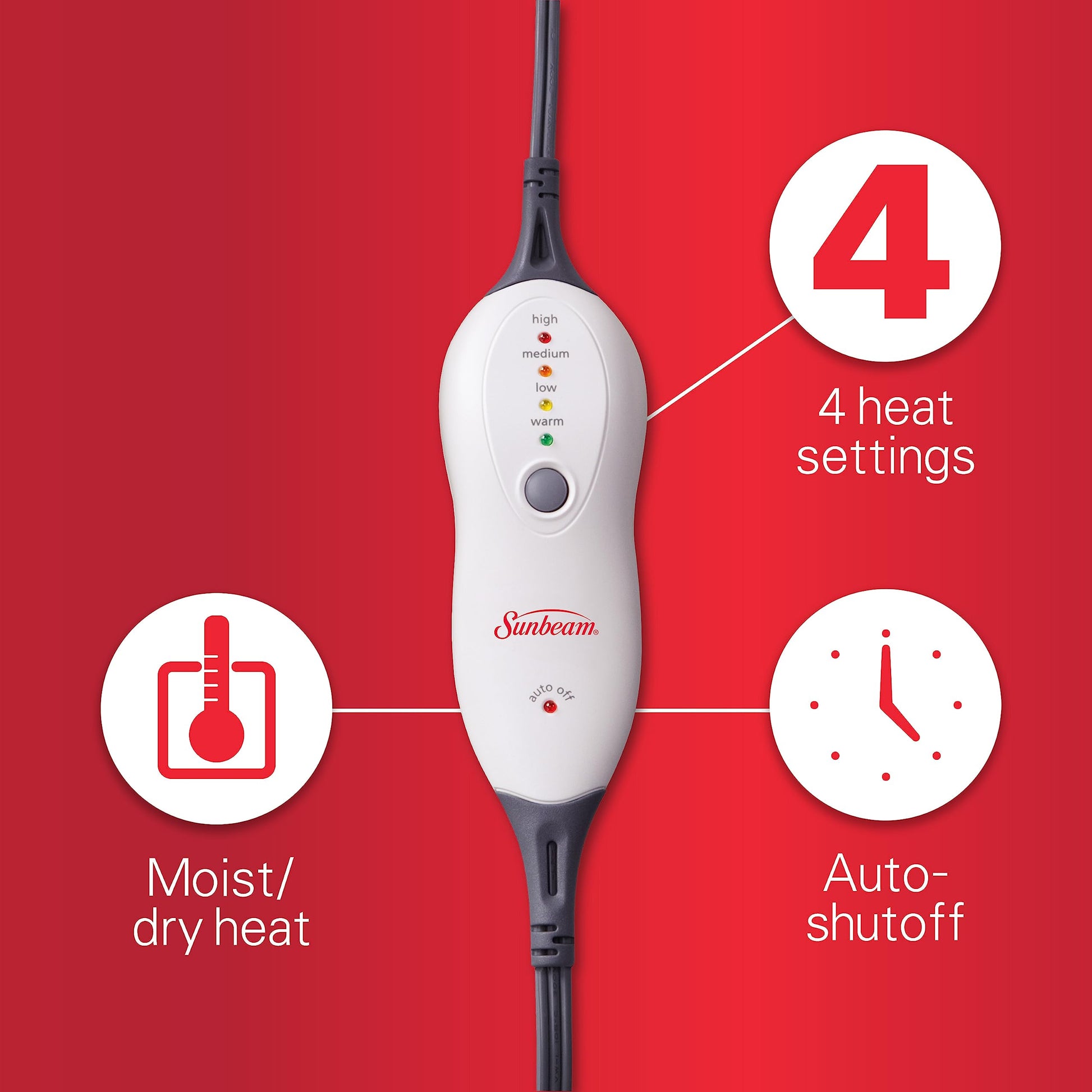 Details: Experience relief with this Sunbeam heating pad that is uniquely designed to target neck and shoulder pain. The pad is contoured to deliver gentle heat directly where it's needed while an adjustable collar and weighted edges ensure a personalized fit. It's controlled by a customizable four-level heat controller, allowing you to easily select your preferred level of comfort. The pad features a 2-hour auto shut-off function for safety during extended use. Finally, ensuring easy maintenance, it comes with a super-soft, machine washable micromink fabric cover.
