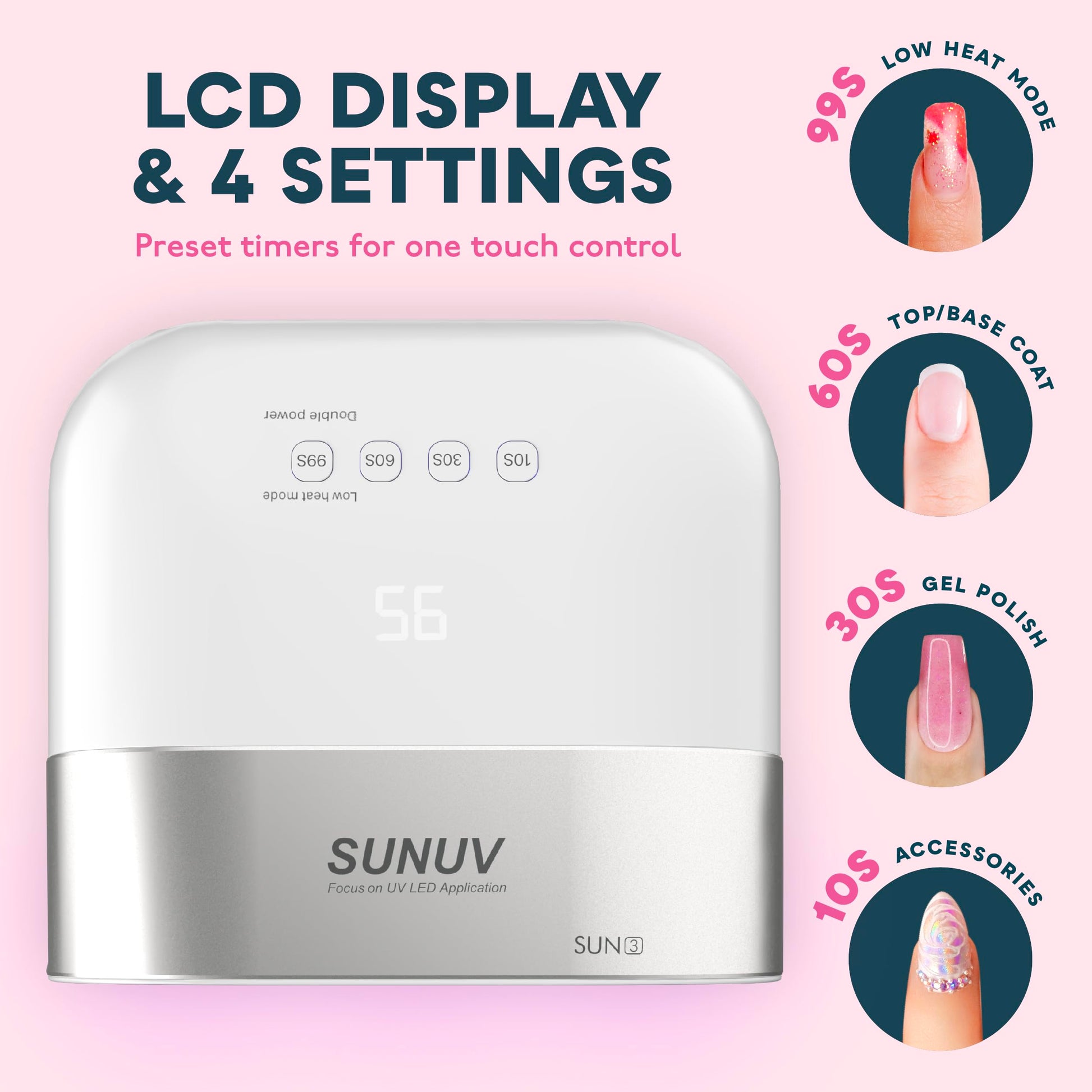 - Cure 2X Faster: Double power button offers cure speeds up to twice as fast as standard UV LED nail lamp—a full cure takes just 30% of traditional nail lamps.