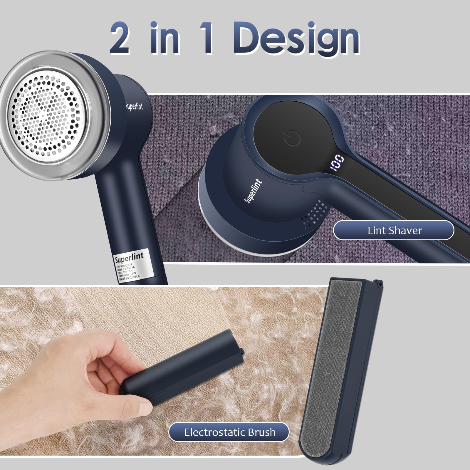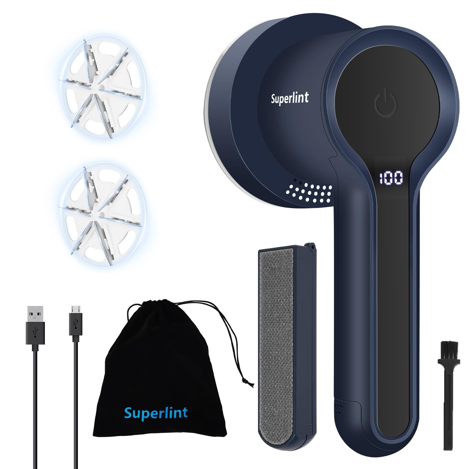 SUPER LINT Electric Fabric Shaver, Sweater Shaver with LED Display, 6-Leaf Blades, Clothes Brush, 3-Speeds for Removing Fuzz and Pill Form Clothing, Couch, Furniture, Navy Blue