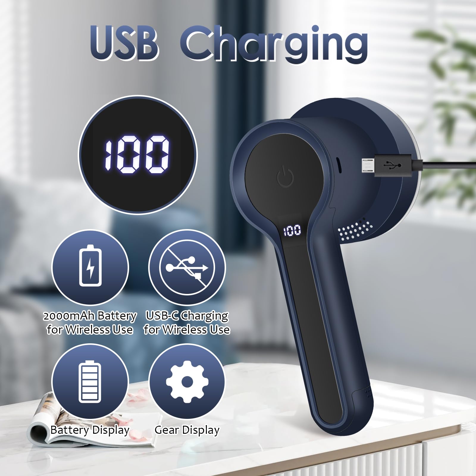 - LED Digital Display: Fabric shaver using high-tech LED display, can be seen clearly the remaining battery and speed gear on the LED screen. The battery level ranges from 0 to 100, when the digital dispaly below 10, it need recharged. It can be charged directly on laptops, desktops, power banks, charger adapters (5V/1A), which is very convenient.