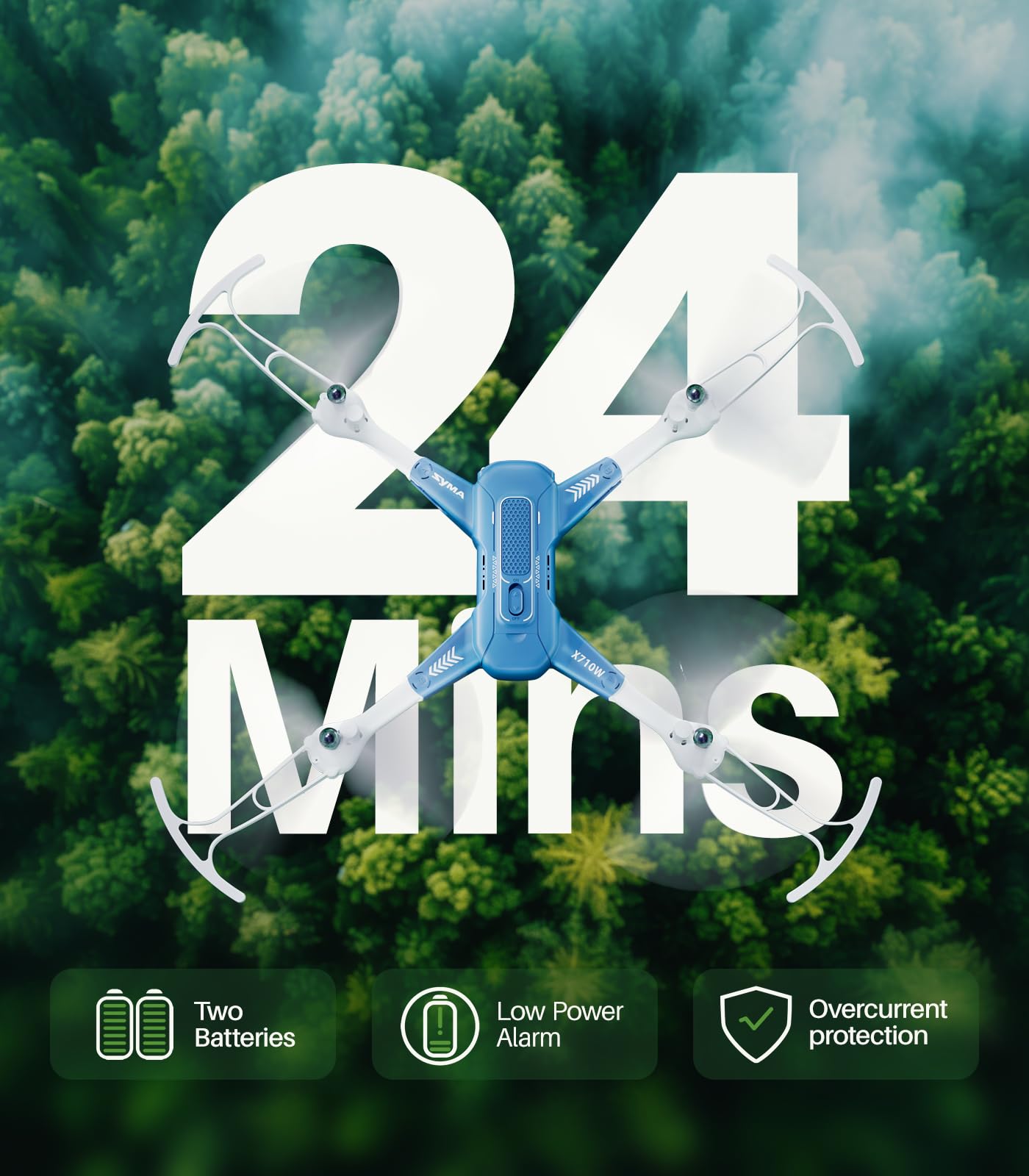 - Extended Flight, Safe Charging: Equipped with two batteries, our mini drone with camera offers up to 24 minutes of flight time. Enjoy hassle-free charging with its modular design. Plus, benefit from low-voltage and over-current protection for battery longevity