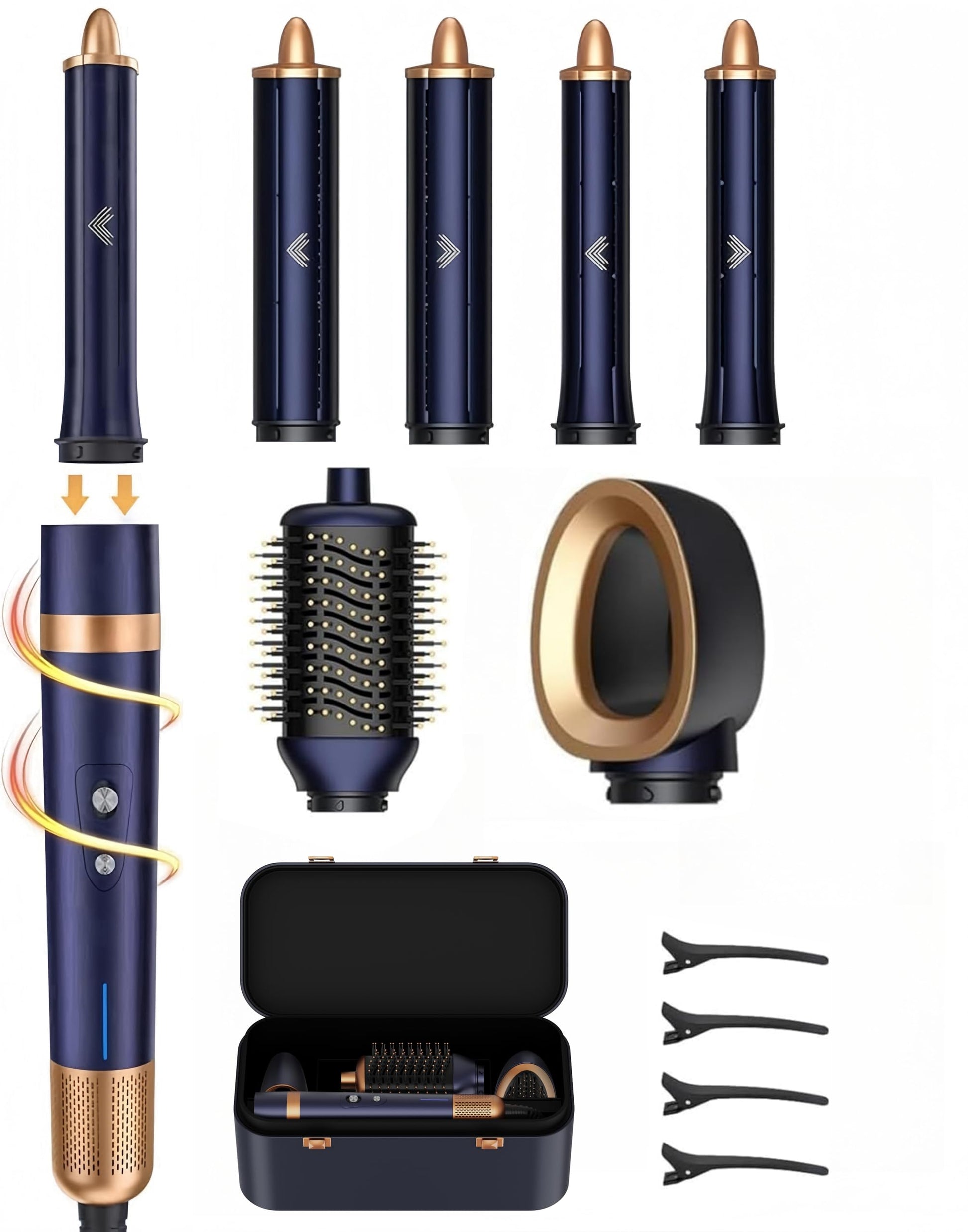 T-GOGO Hair Dryer Brush Professional: 6 in 1 Hot Air Hair Styler & Dryer Set, Powerful Hair Air Curling Iron High-Speed Negative Ionic Blow Dryer, Auto-Wrap, No Heat Damage (Dark Blue)