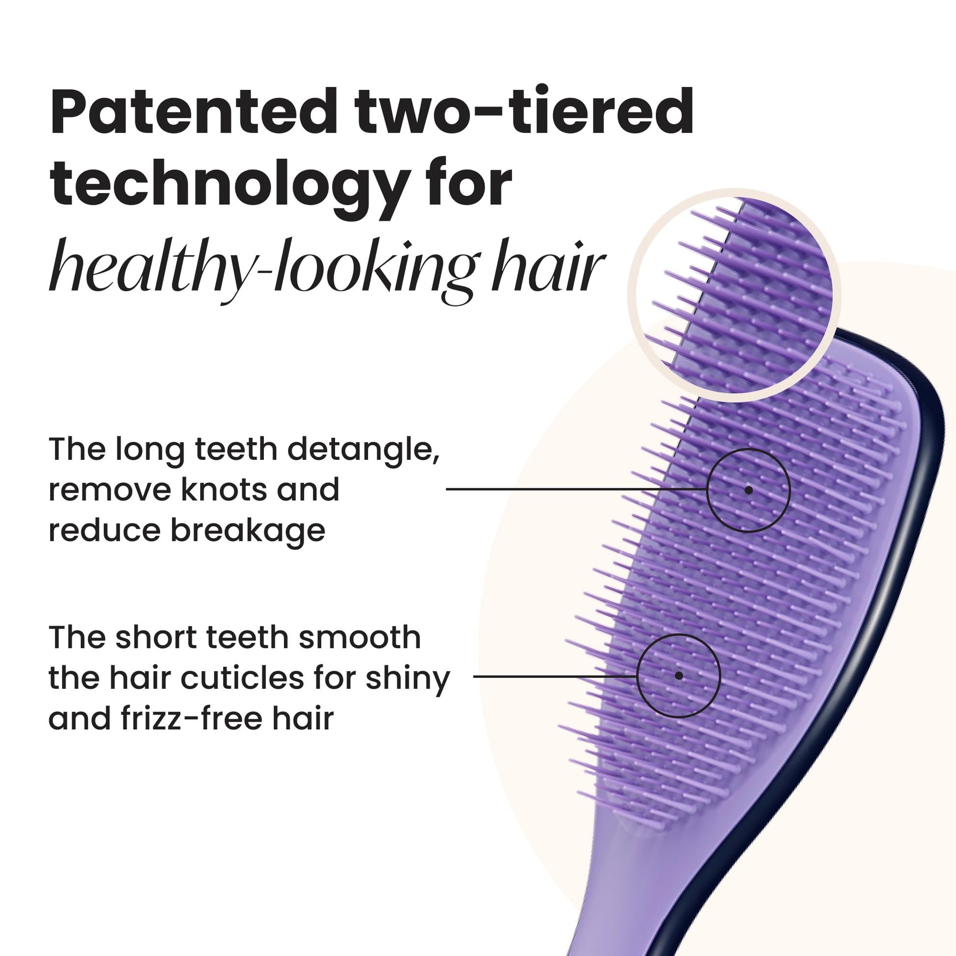 - Innovative Design: Featuring our patented two-tiered teeth technology. The long, flexible teeth detangle, remove knots and reduce breakage, while the short teeth smooth strands, for frizz-free hair