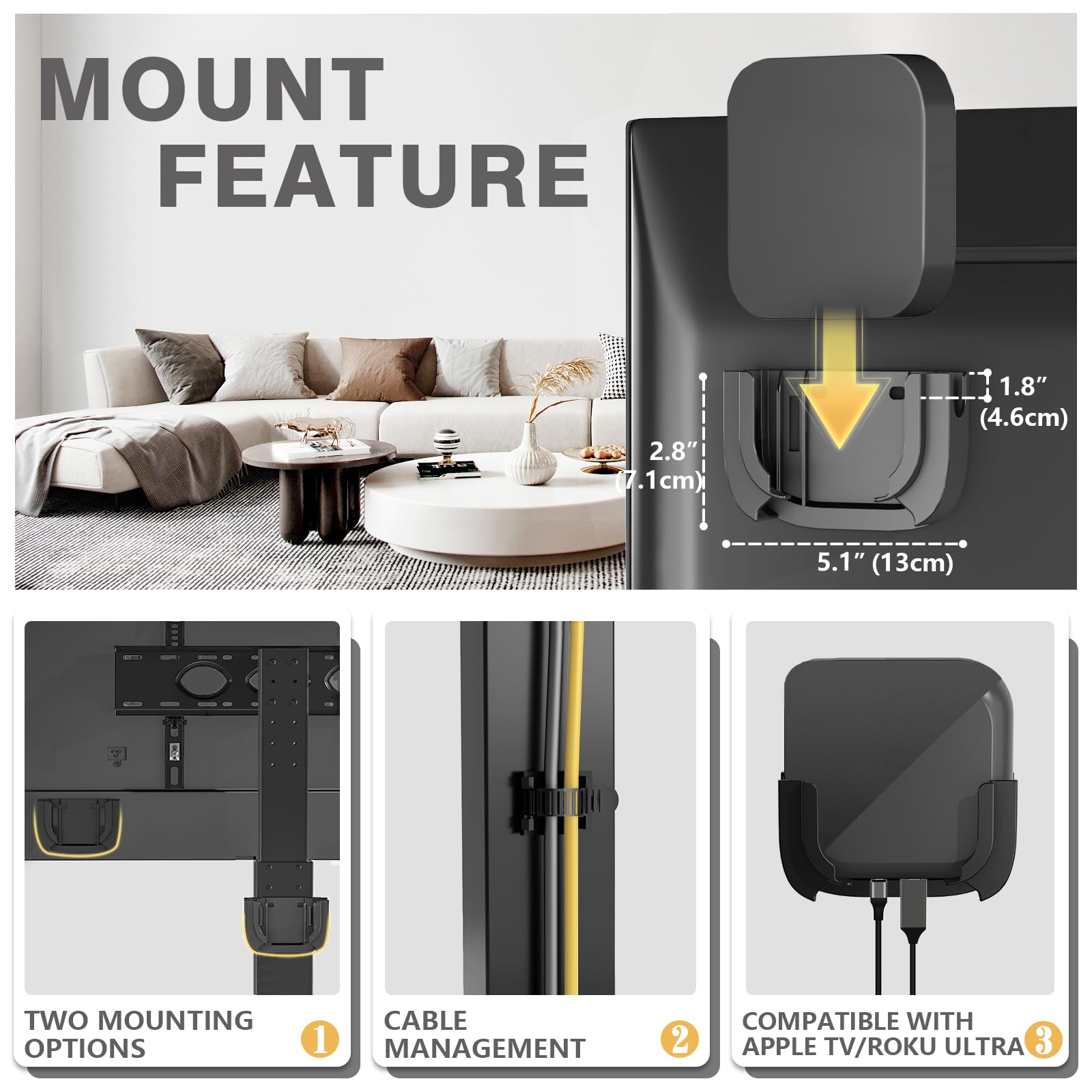 - Apple TV Mount & Cable Management: A tv mount compatible with Apple TV and Roku Ultra will come with the standing tv mount and keep everything stream lined and organized. You can install it behind tv or on the pole simply and quickly without drilling holes. The portable tv stand has a matte black finish of the shaft with cable management and extra accessories for sticking multi plug outlet to collect all cables and keep everything in order.
