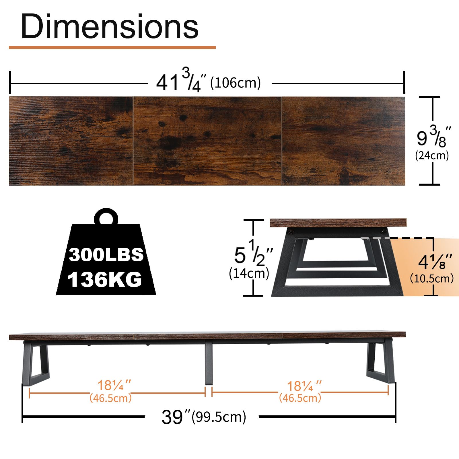 TEAMIX 42 inch Large [Dual] [Monitor] [Riser],Rustic Brown Extra Long TV [Stand Wood & Steel Desktop [Riser] with Storage for [Dual] Screen Office Desk Organization