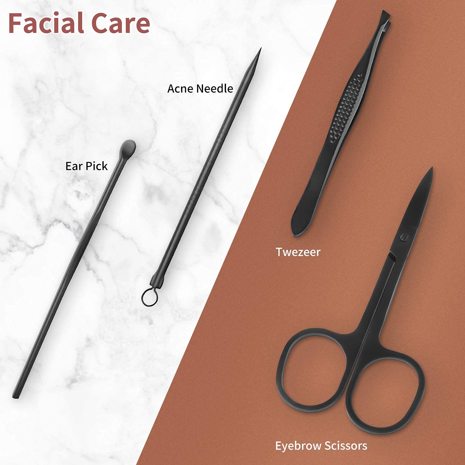 - [12Pcs Multipurpose Manicure Kit ] -- Right number for your hand , face and feet , there is no extra useless stuff , every item is just for your daily use .Hand Care: 3pcs nail clippers,1 pc finger nail file, 1pc V-Shaped Cuticle Trimmer, 1pc Double-sided Push Stick, 1pcDouble-sided Cuticle Pusher,Face Care: 1pcs Eyebrow tweezer, 1pc eyebrow Scissors, 1pc ear pick, 1pc acne pin, Foot Care: 1pc Cuticle Nipper.