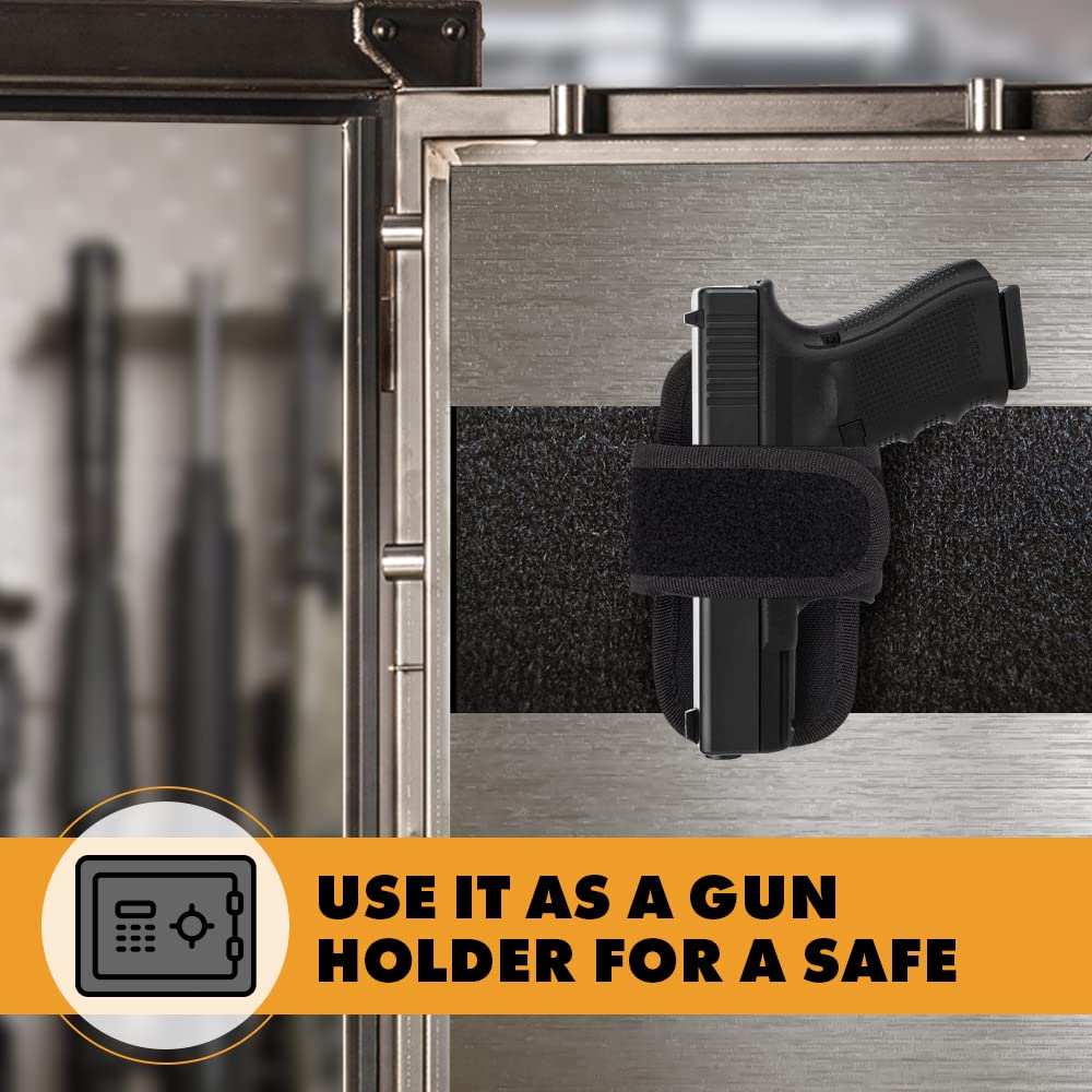 - HIGH-QUALITY MATERIALS: Tactical holster basis material is extra-strong wear-resistant cordura (nylon) and its outer layer is made of high quality velcro(hooks) that allows to attach the holster in any position and at any angle. The holster is equipped with an adjustable velcro strap to find the right and tight fit for your gun.