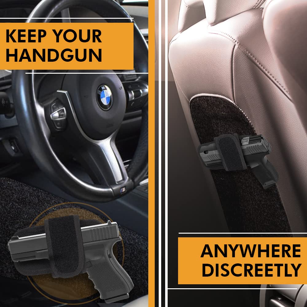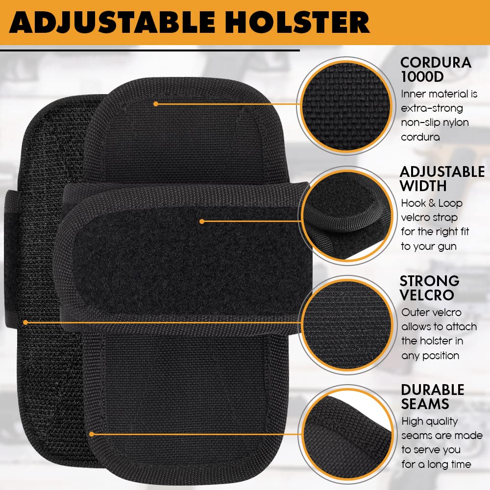 - ADJUSTABLE GUN HOLSTER for concealed carry. Material: CORDURA 1000D; Color: BLACK. Size - 6.1”x3.15”; Hand Orientation - Ambidextrous. Attachment Type: Hook & Loop.