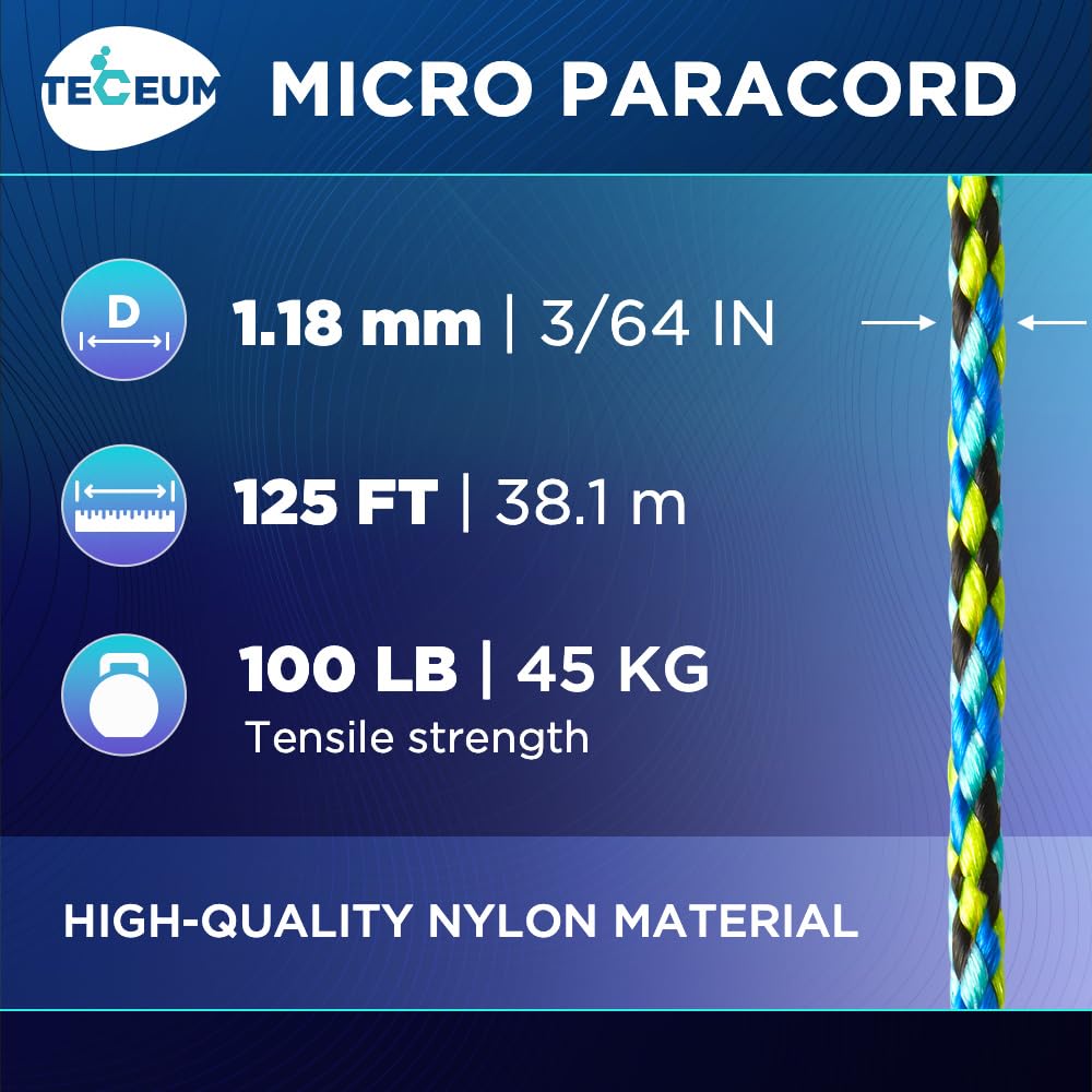 - MICRO PARACORD: 1.18 mm thick. Color: Aquatica. Length - 125 ft (38.1 m). Tensile Strength: 100 LB (45.35 kg). Thin, lightweight and strong. Comes on a compact & convenient spool (3.07” x 3.07”).