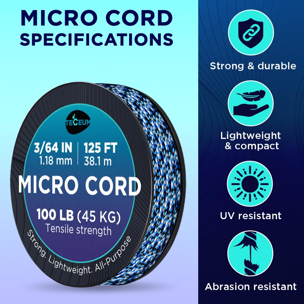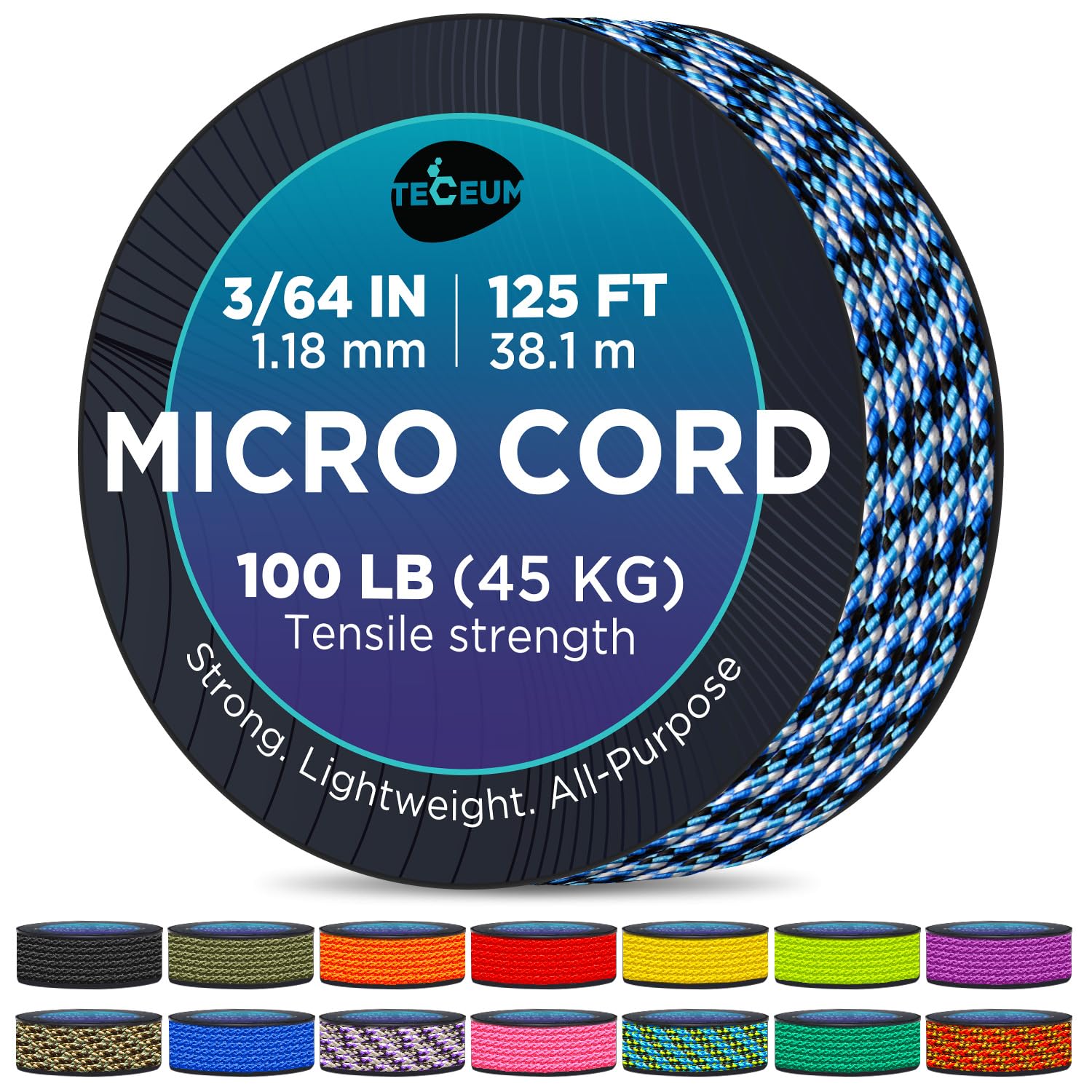 - MICRO PARACORD: 1.18 mm thick. Color: Blue Snake. Length - 125 ft (38.1 m). Tensile Strength: 100 LB (45.35 kg). Thin, lightweight and strong. Comes on a compact & convenient spool (3.07” x 3.07”).