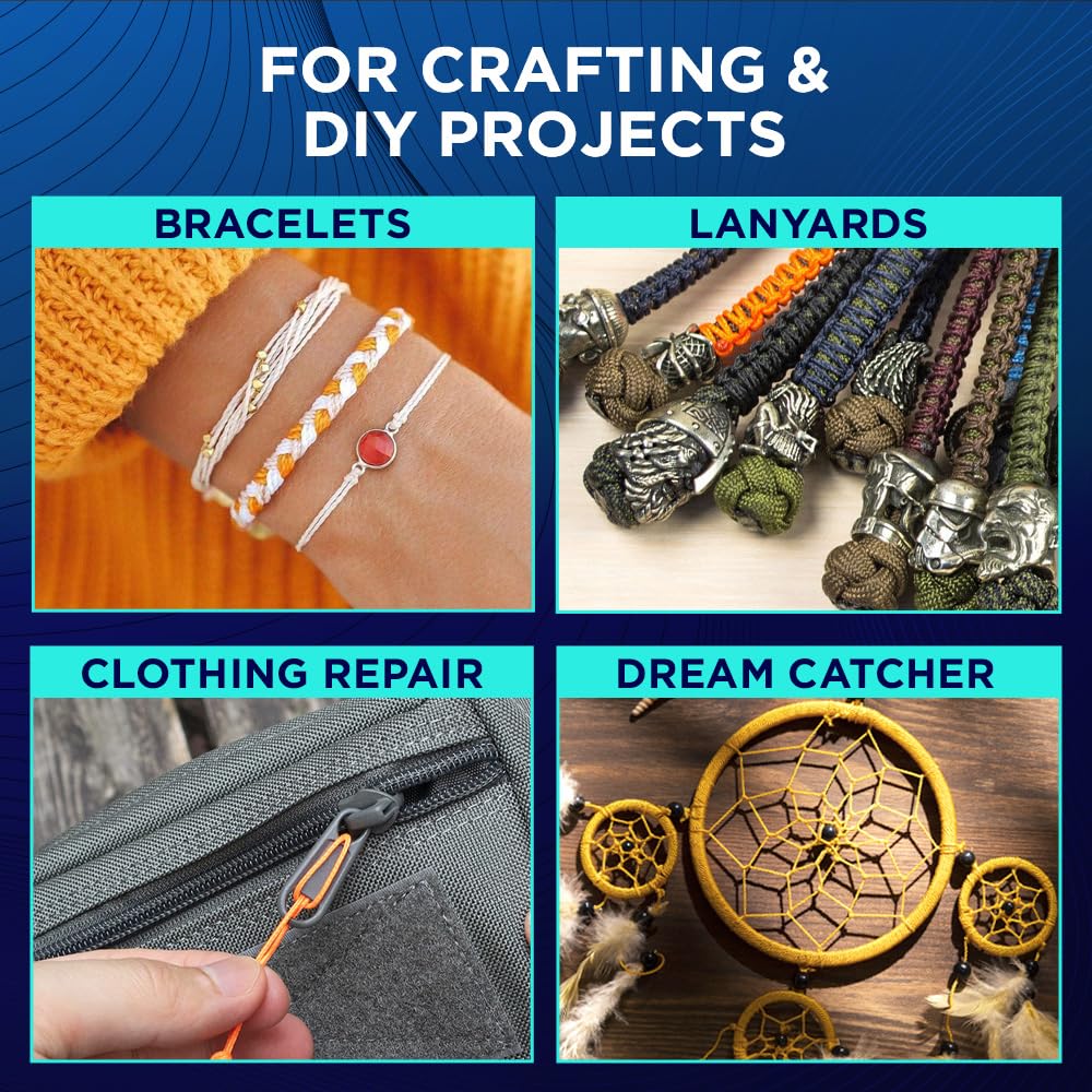 - MULTIPURPOSE: Great for arts and crafts applications, making bracelets, keychains, lanyards, dream-catchers, jewelry, home decor and other DIY projects. It is widely used for household repairs, like repairing parts of wind chimes, emergency kits, tarp tie-downs, and outdoor activities like camping, hiking and fishing.