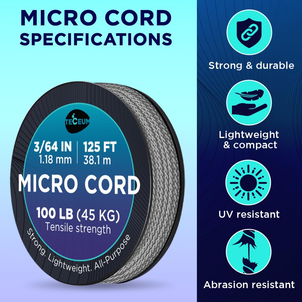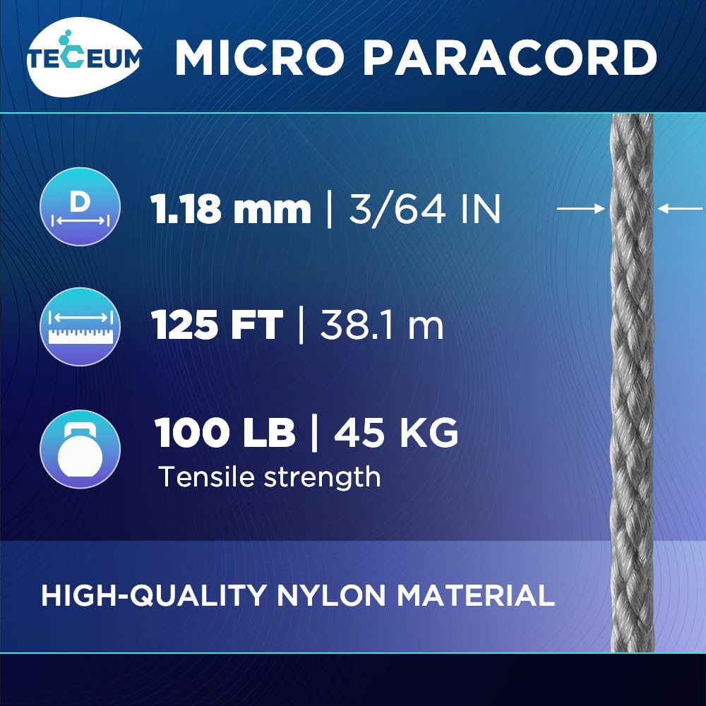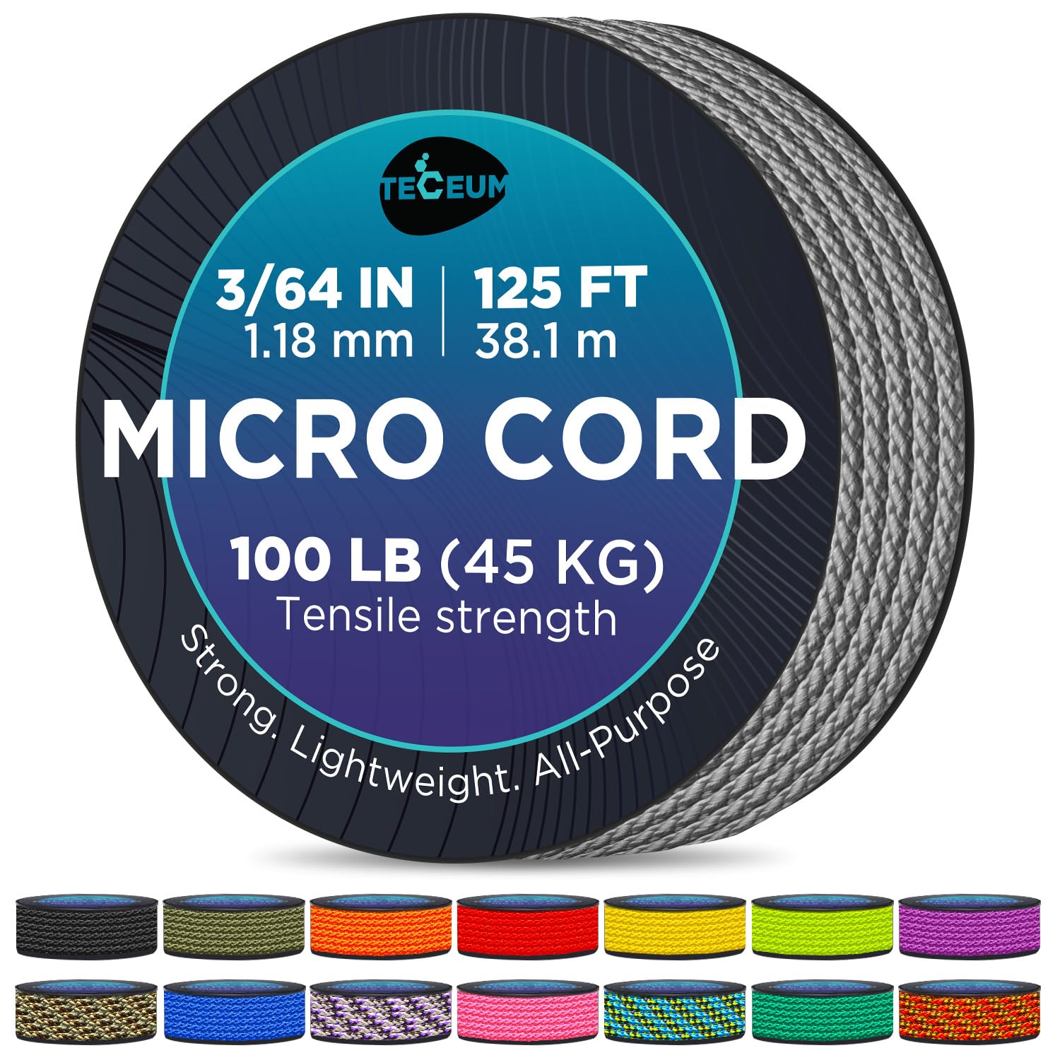 - MICRO PARACORD: 1.18 mm thick. Color: Gray. Length - 125 ft (38.1 m). Tensile Strength: 100 LB (45.35 kg). Thin, lightweight and strong. Comes on a compact & convenient spool (3.07” x 3.07”).