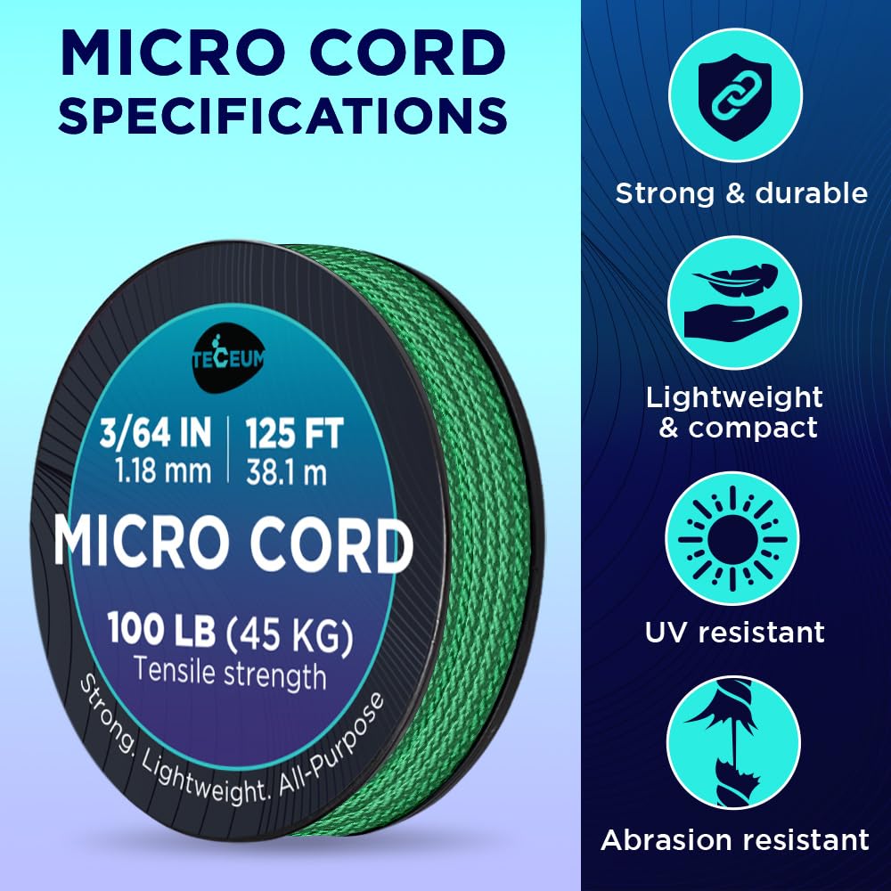 - MICRO PARACORD: 1.18 mm thick. Color: Green. Length - 125 ft (38.1 m). Tensile Strength: 100 LB (45.35 kg). Thin, lightweight and strong. Comes on a compact & convenient spool (3.07” x 3.07”).