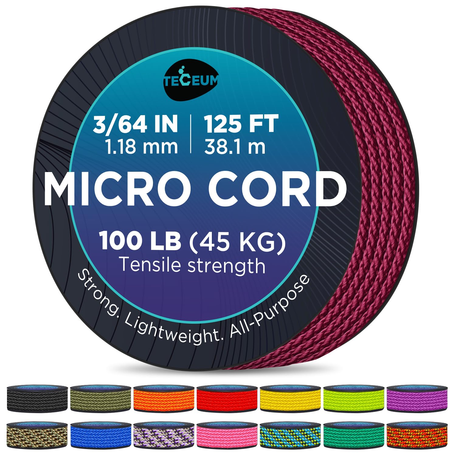 • MICRO PARACORD: 1.18 mm thick. Color: Maroon. Length - 125 ft (38.1 m). Tensile Strength: 100 LB (45.35 kg). Thin, lightweight and strong. Comes on a compact & convenient spool (3.07” x 3.07”).