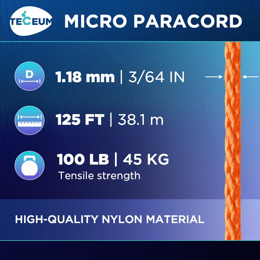 - MICRO PARACORD: 1.18 mm thick. Color: Orange . Length - 125 ft (38.1 m). Tensile Strength: 100 LB (45.35 kg). Thin, lightweight and strong. Comes on a compact & convenient spool (3.07” x 3.07”).