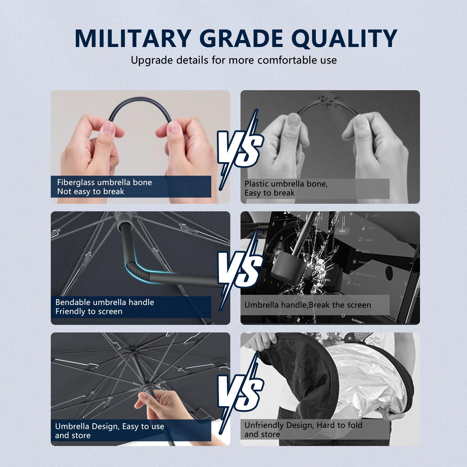 - Military-Grade Durability -Tecoom windshield sunshade made of high quality materials. Replaces traditional silver-coated fabric with a 240T high-density polyester base and heat-reflective cooling coating. The vehicle sun shade windshield also reinforced with 8 rustproof fiberglass ribs which is anti-rust, lightweight, and durable. Outperforms traditional metal frames with 3x longer lifespan