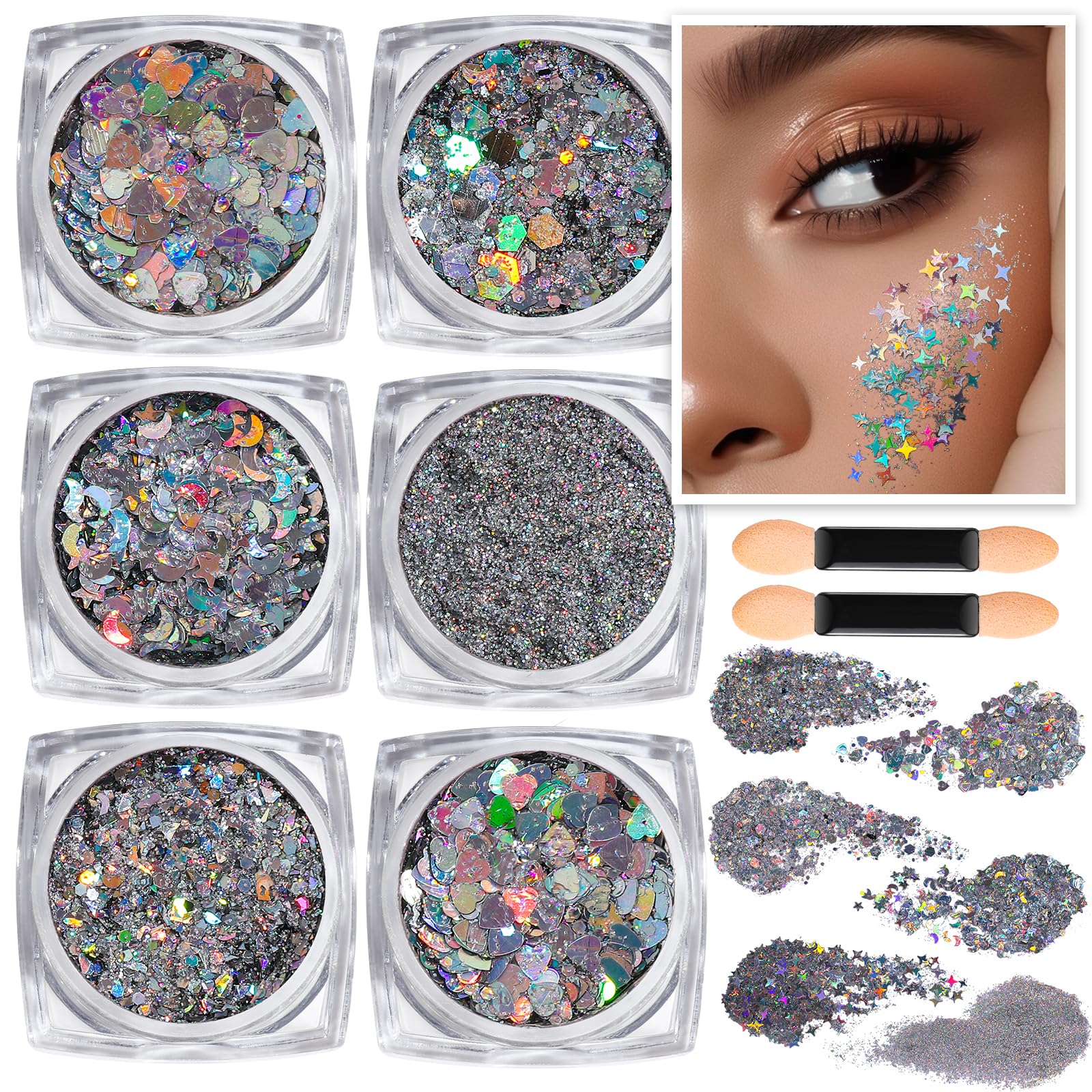 - SPARKLY BODY GLITTER GEL: Teenitor silver holographic body glitter set is absolutely stunning. The variety of shapes – stars and moons, starbursts, hearts – along with the different sizes of glitter offer endless possibilities for creating unique and dazzling looks. These came nicely packaged, sealed, and with multiple applicators