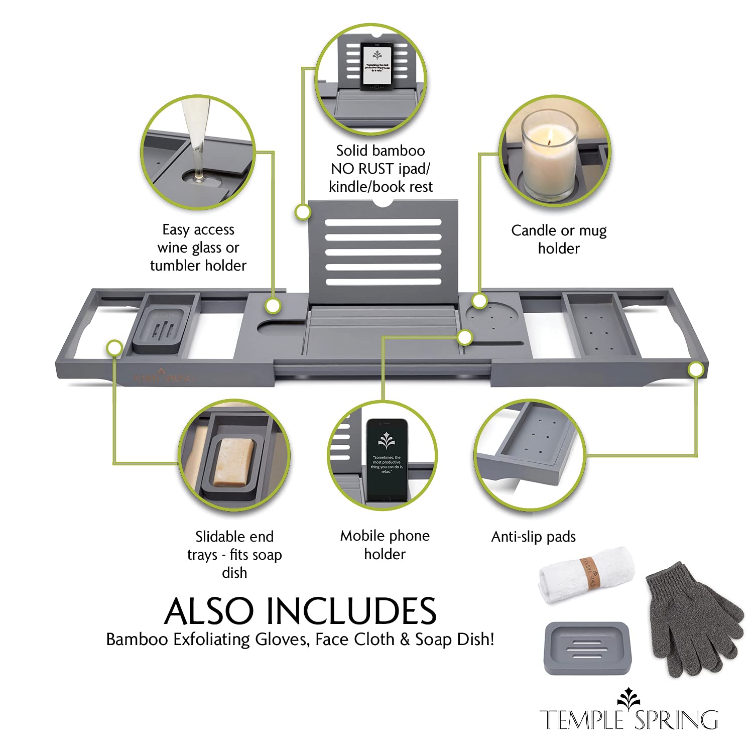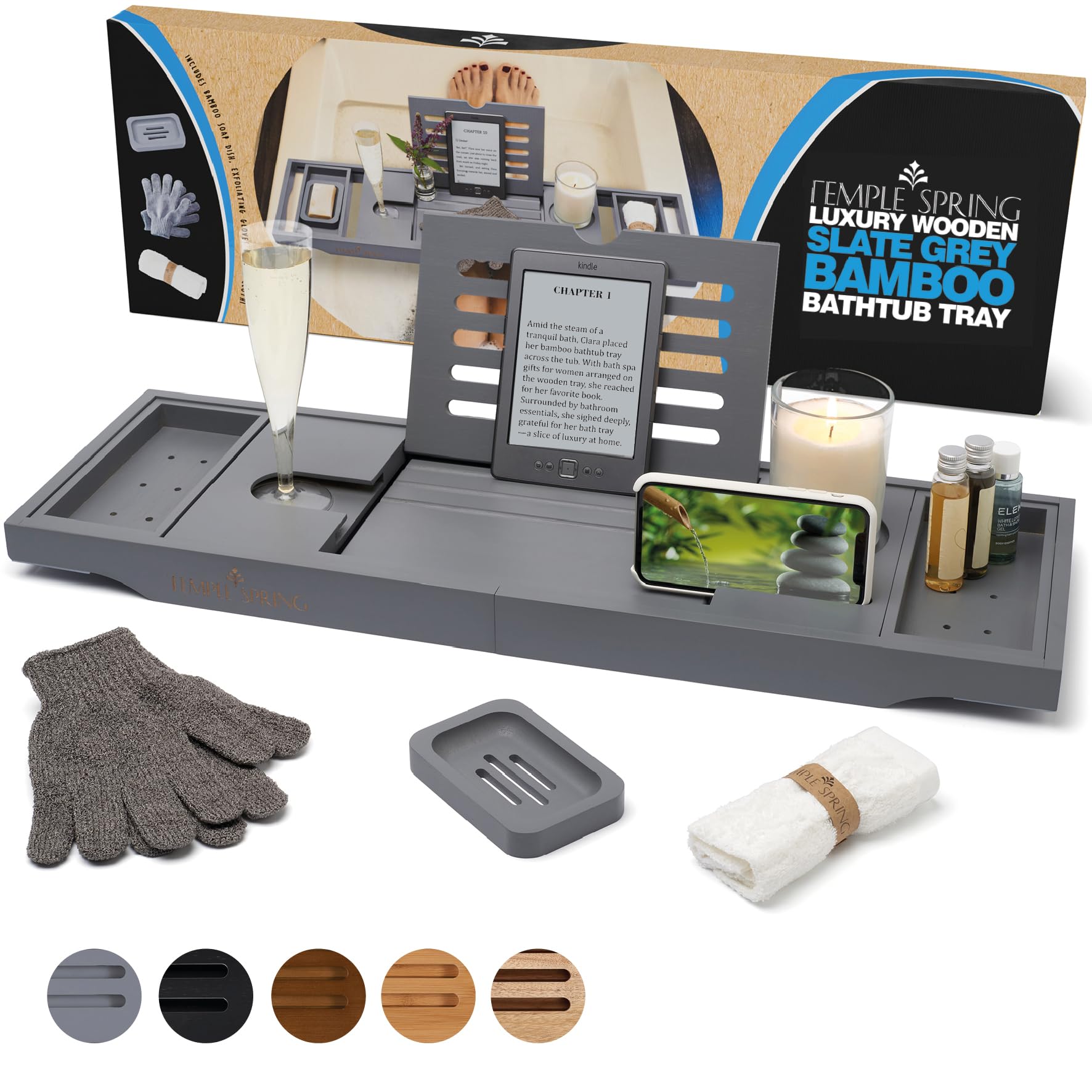 Temple Spring Wooden Bathtub Tray, Bamboo Bathroom Accessories, Bath Tray for Tub, at Home Spa Essentials, Board for Tub Table, Bath Caddy for Bathtub Accessories & Bathroom Essentials – Slate Grey