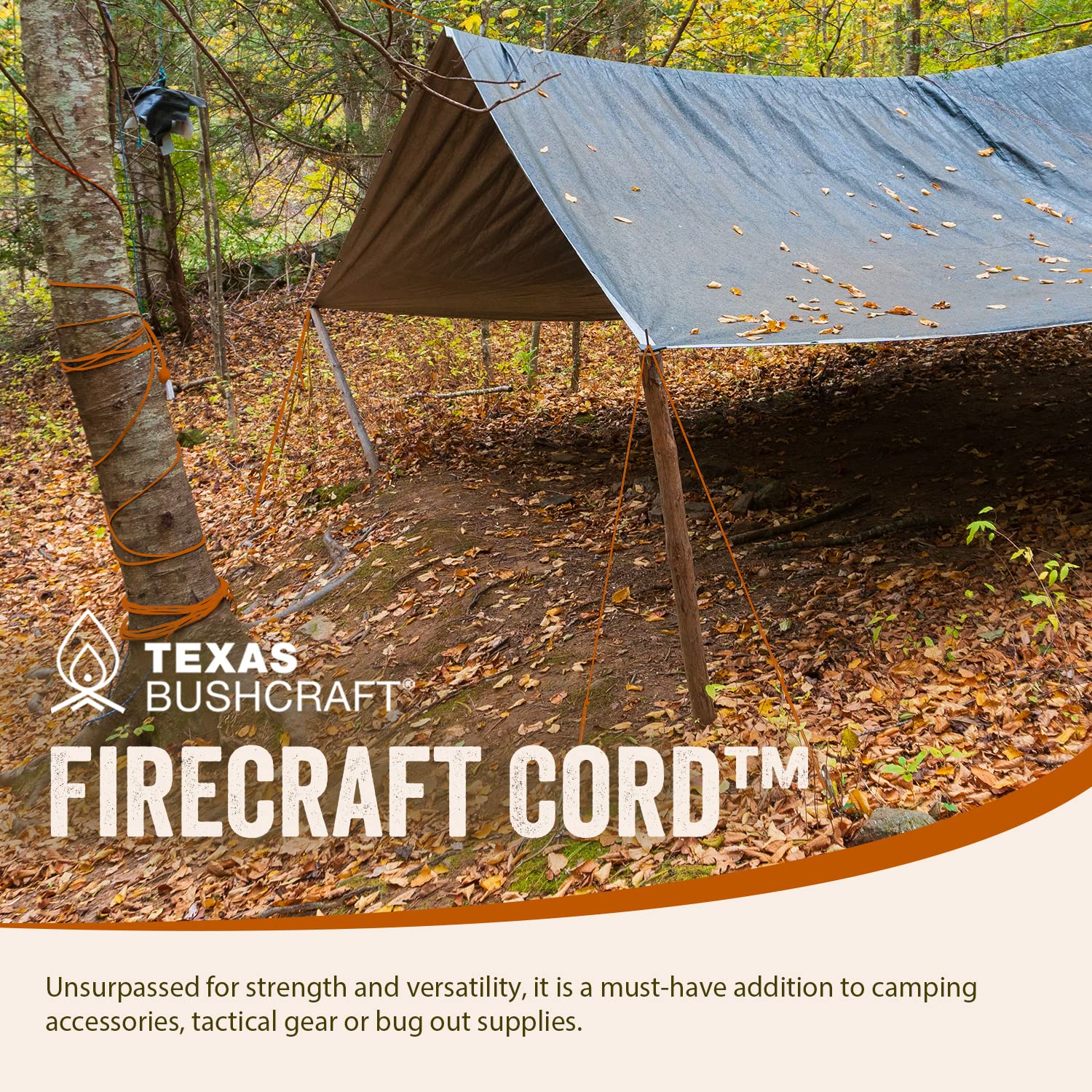 Details: A New Twist on Utility Cord Texas Bushcraft has made the first real advancement in paracord rope with our Firecraft Survival Cord. Our patent-pending design adds 3 additional strands to conventional tactical cord for greater functionality in any predicament. More flexible and weather-resistant than survival wire, Texas Bushcraft Firecraft Cord can be used to lash together makeshift shelter, as snare cord to trap wild game for food or for suturing wounds and splinting injured limbs until help reaches you. 3 Strands Improve Your Odds Texas Bushcraft Firecraft Cord features a water-resistant waxed cotton tinder and a waxed 150D thread for suturing and canvas-sewing. The third strand is a 40-lb test PE fishing line with enhanced durability in salt water environments. With no metal-based strand or monofilament strand, ours is a more pliable fire cord for knotting. Make a handcuff knot for dragging a carcass or clove hitches for rope ladders and railings. Because you can unknot and reuse our para cord countless times, it is an excellent camping rope. Must-Have Survival Equipment This strong cordage is available in bulk lengths of 25- and 100-feet. Select from Army Green for a camo paracord that offers personal concealment or shrouding of trip wires and snares. Our Burnt Orange outdoor rope is more visible to the human eye, ideal for leisurely camping and hiking. Both are great for creating paracord bracelets that combine fashion and function. Tie-up the loose ends in your tactical gear. Add Texas Bushcraft Firecraft Survival Cord to your emergency supplies today.