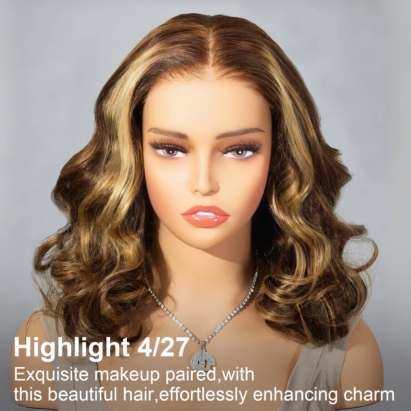 Tinashe 12Inch Wear and Go Glueless Bob Wig Human Hair Highlight Bob Wig Human Hair Honey Blonde 5x6 Body Wave Wigs for Beginners Glueless Short Bob Wig(12inch,P4/27 Loose Body Bob Wig)