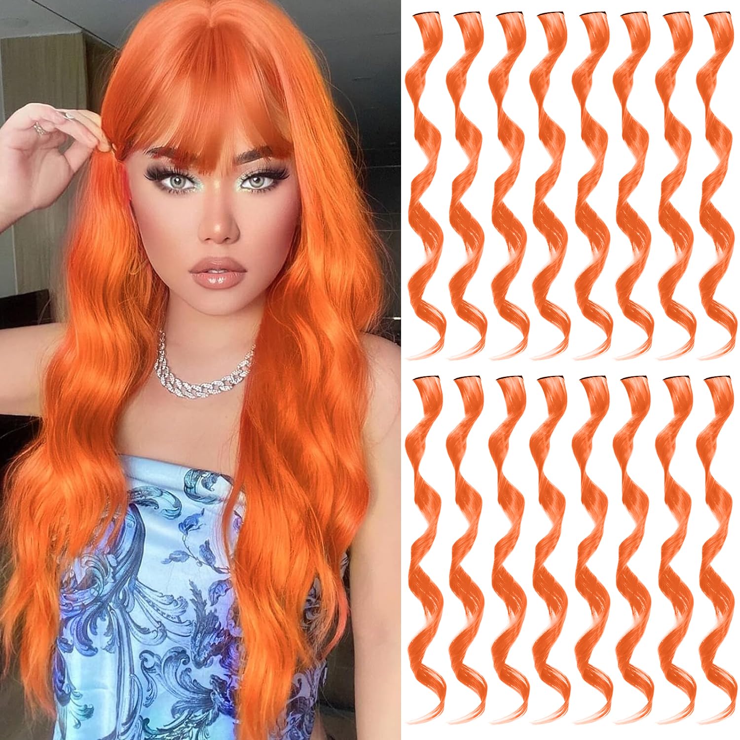 TOFAFA 16 Pcs Colored Hair Extensions Curly Wavy Clip in Synthetic Hairpiece Streak for Girls Women Kid, Multi-colors Party Highlights Cosplay Festival Gift(Orange)