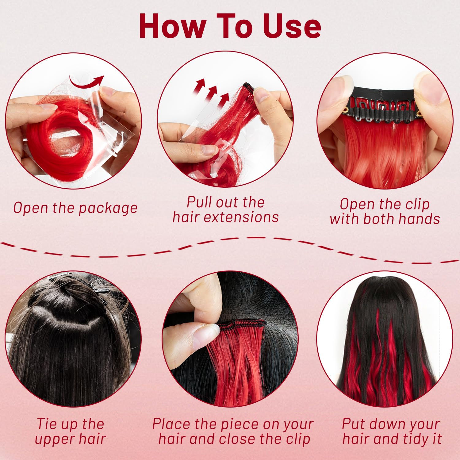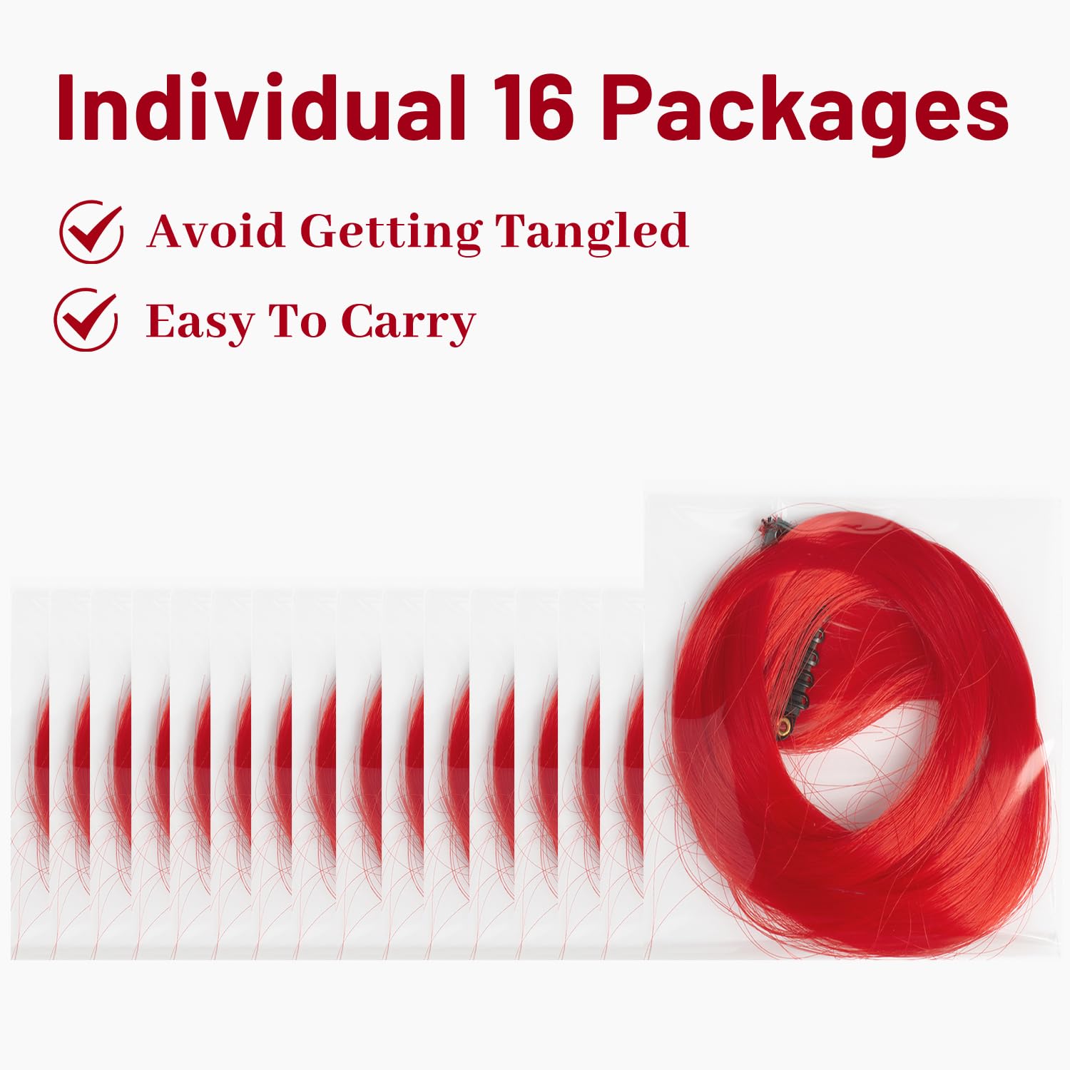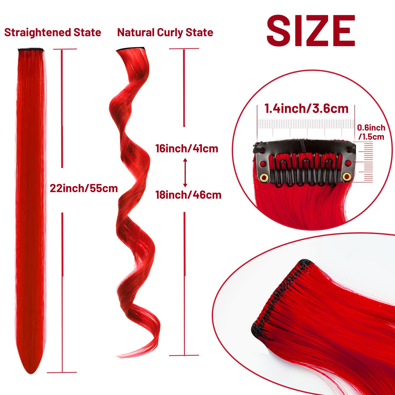 - 2. Material: 100% Heat resistant synthetic. Red hair extensions can be trimmed and straightened as needed. The hair is long enough that you can trim it to fit your hair length