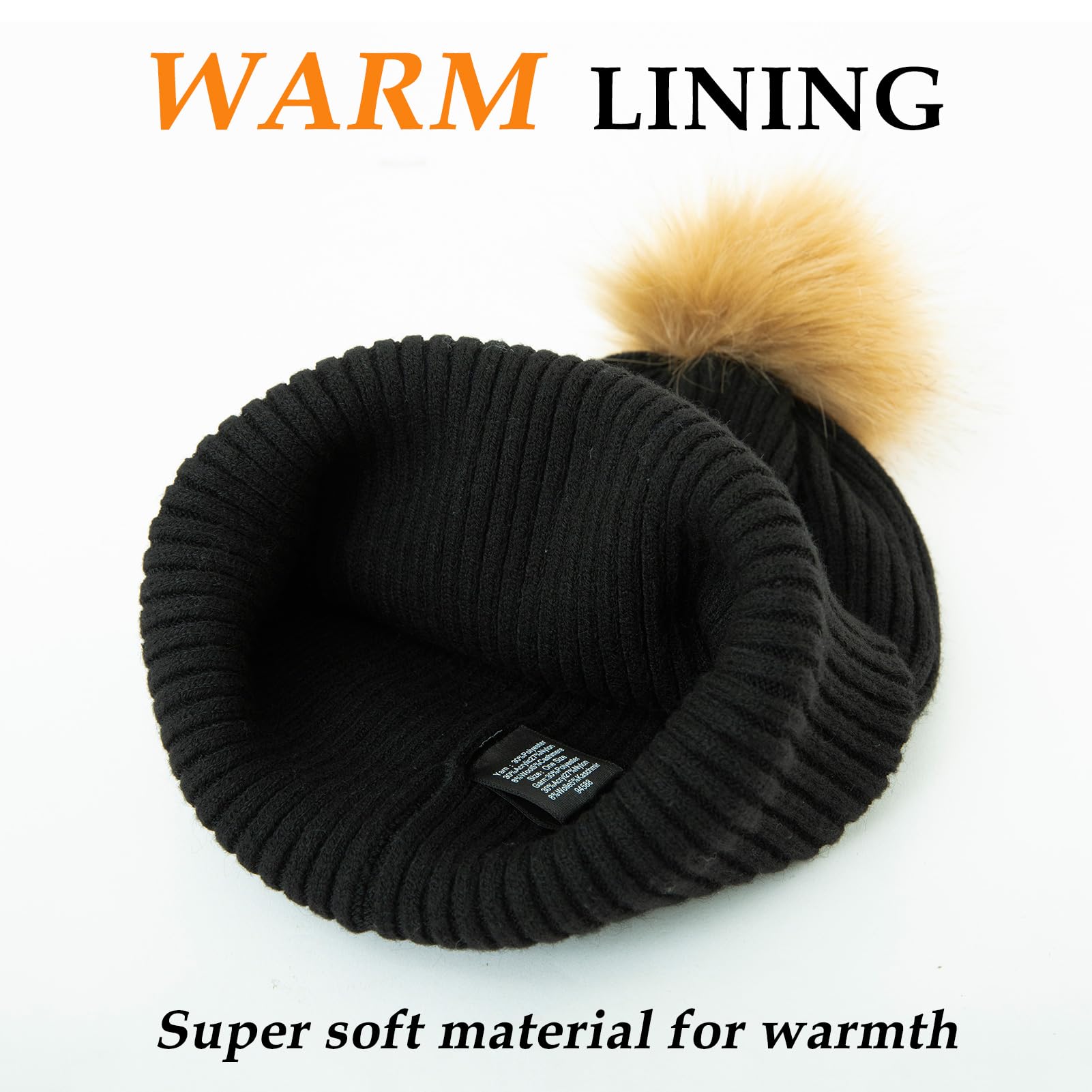 TOP-EX M/L/XL Women Winter Beanie Pom Hat Warmer Wool Cashmere Knitted Cap Double Layer Hat Cold Weather Snow Hat with Faux Fur Pompom Black