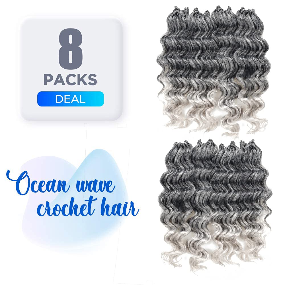ToyoTree Ocean Wave Crochet Hair - 9 Inch 8 Packs Ombre Gray Short Curly Deep Wave Crochet Hair, Synthetic Ocean Wave Braiding Hair Extensions (9 Inch,T-Gray-8P)
