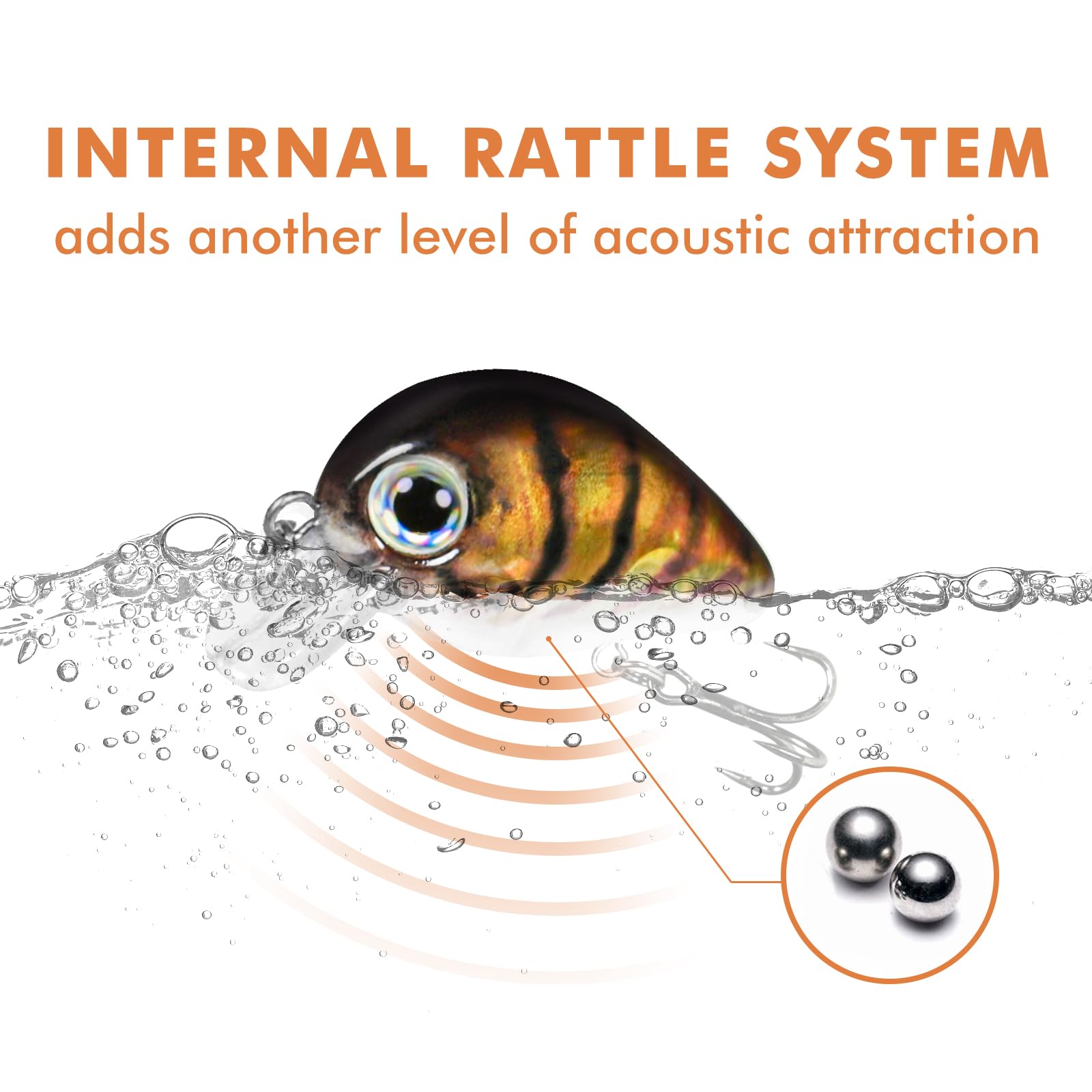 - Built-in Rattle: The stainless steel ball inside that generate an ear-bursting underwater sound, making fishing lures more easily to be sensed. The fishing lures with built-in rattle allow long-distance casting and makes noise to attract more fishes.