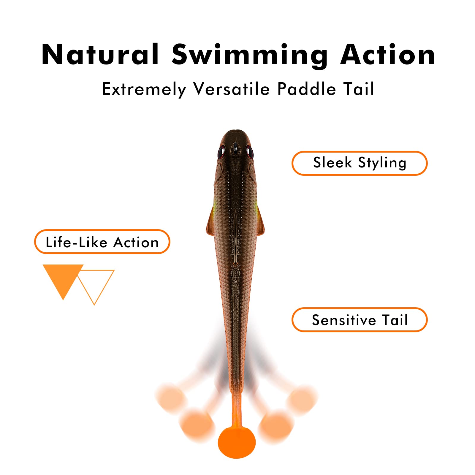 - JAPAN DESIGN - Constructed from high quality materials from Japan, expertly design and rigorous testing of light refraction fish pattern make TRUSCEND 'Shad Paddle Tail Bait' more realistic and attractive. The soft plastic fishing lures who lively Japanese design perfectly emulates erratic baitfish action.