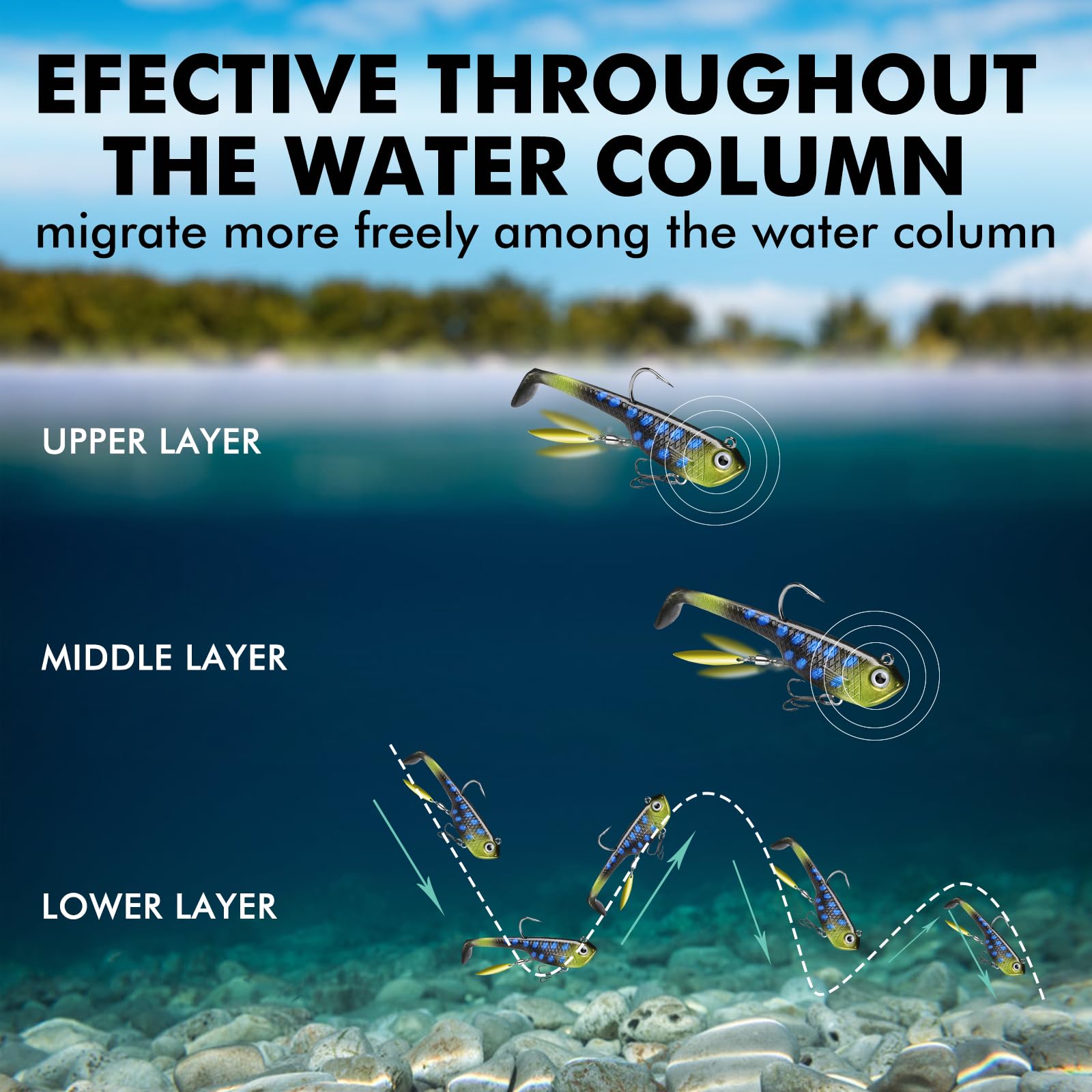 - UNIQUE DESIGN - 3D t-shaped soft tail with 360° spinner blade can kicks and thumps even at slow speeds. A super-lifelike soft jerkbait whose lively design perfectly emulates erratic baitfish action.