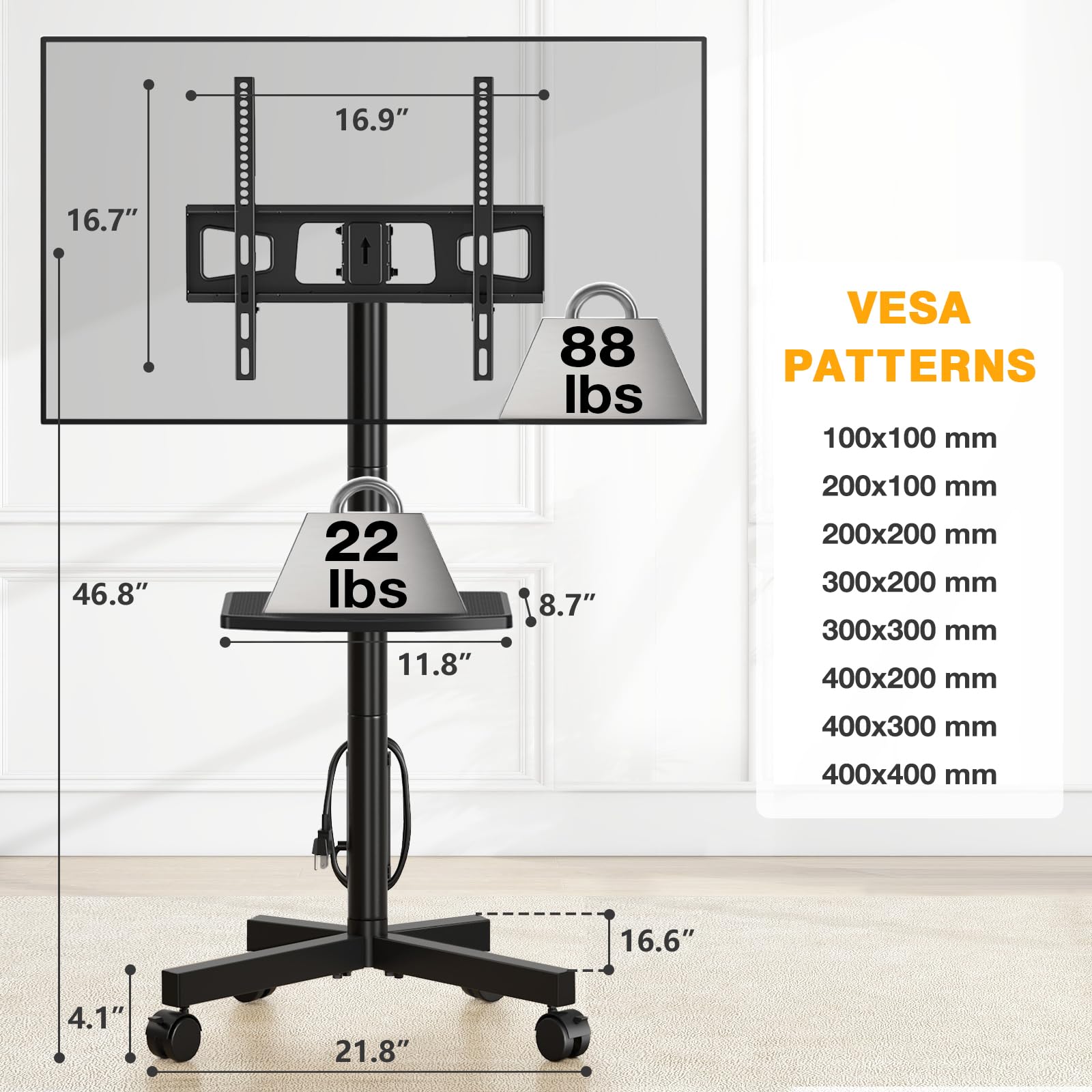 - Wide Compatibility: Our tv stand rolling cart fits most 23 32 37 43 47 50 55 60 inch TVs up to 88 lbs with VESA hole patterns of 100x100mm to 400x400mm.