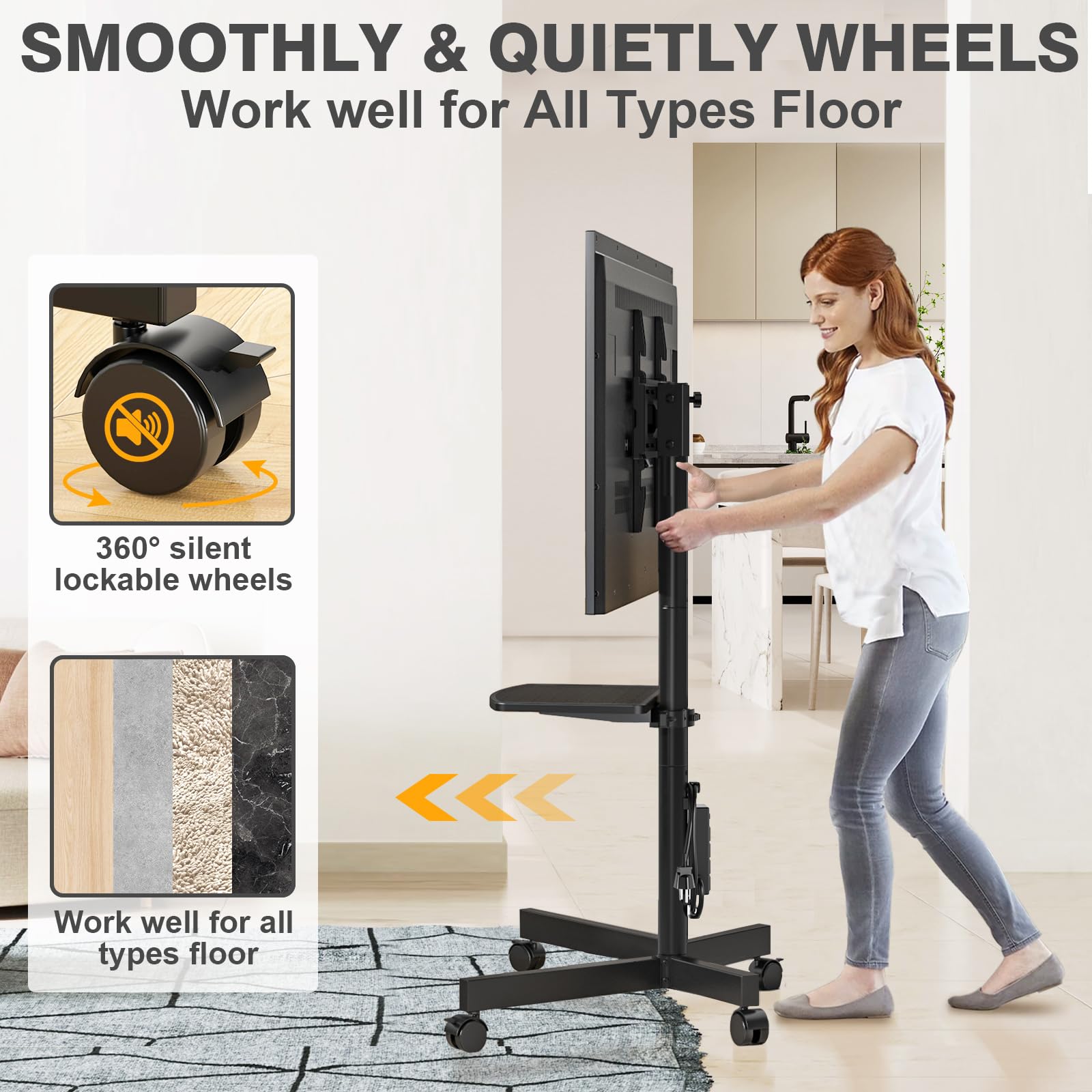 - Upgraded 360° Lockable Wheels-Work Smoothly on All Types Floor: The tv cart rolling tv stand allows you to easily move the TV and lock the wheels wherever you want. The base of the height adjustable tv stand is a space-saving design and you can place it in the corner or at end of bed. The mobile tv cart is also a good choice for living room, bedroom, apartment, office, conference room, studio, exhibition, trade show.
