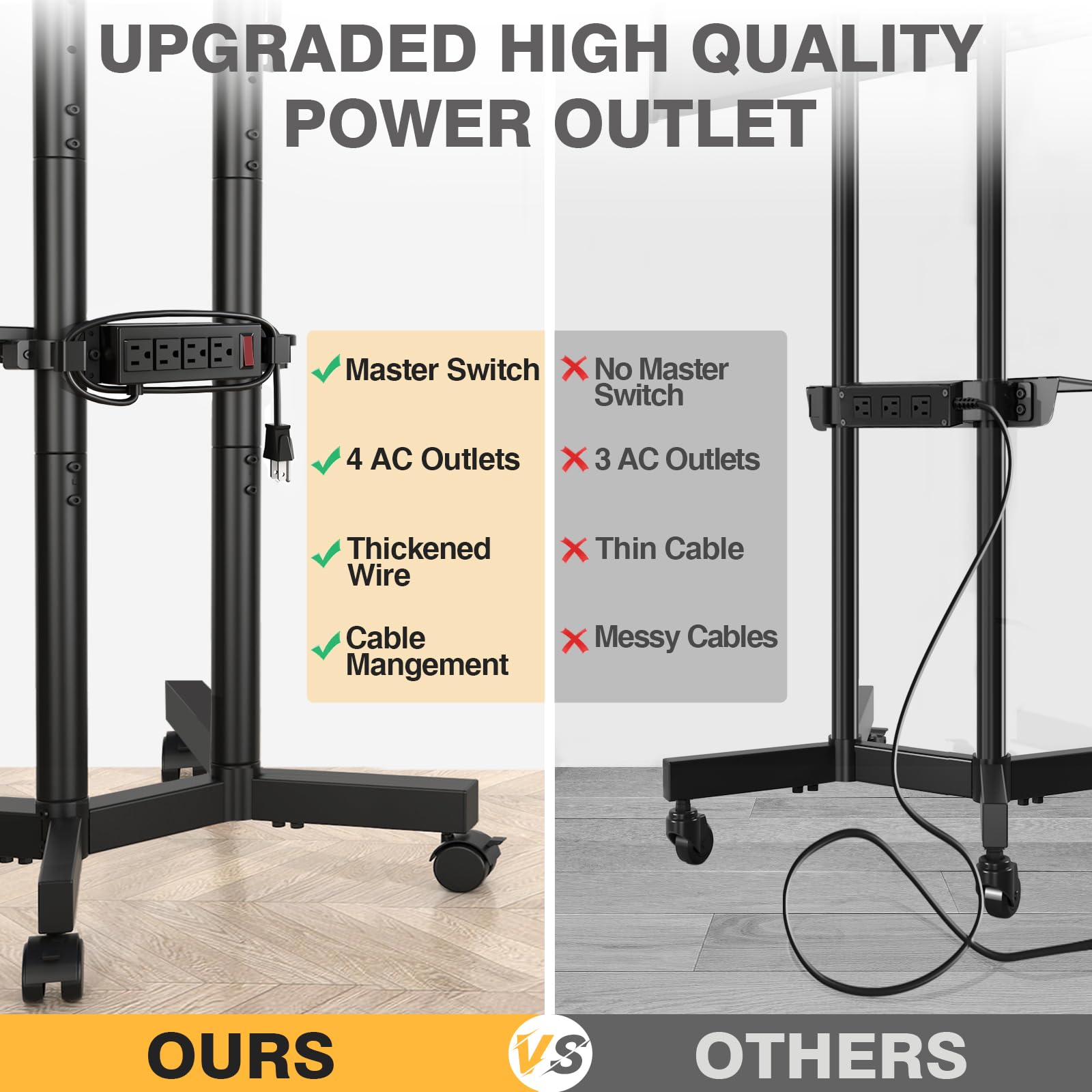- Mobile TV stand with Power outlets: Our tv stand with wheels will come with power outlets. The power strip has 4 AC outlets that can power 4 devices simultaneously. The thickened and lengthened 6.5-inch power cord is made of 16AWG pure copper, safer than the others' and has better current carrying capacity (12A). It also has a master switch that can be turned off when you are not using it, preventing false touch and ensuring the safety of your family, kids and pets.