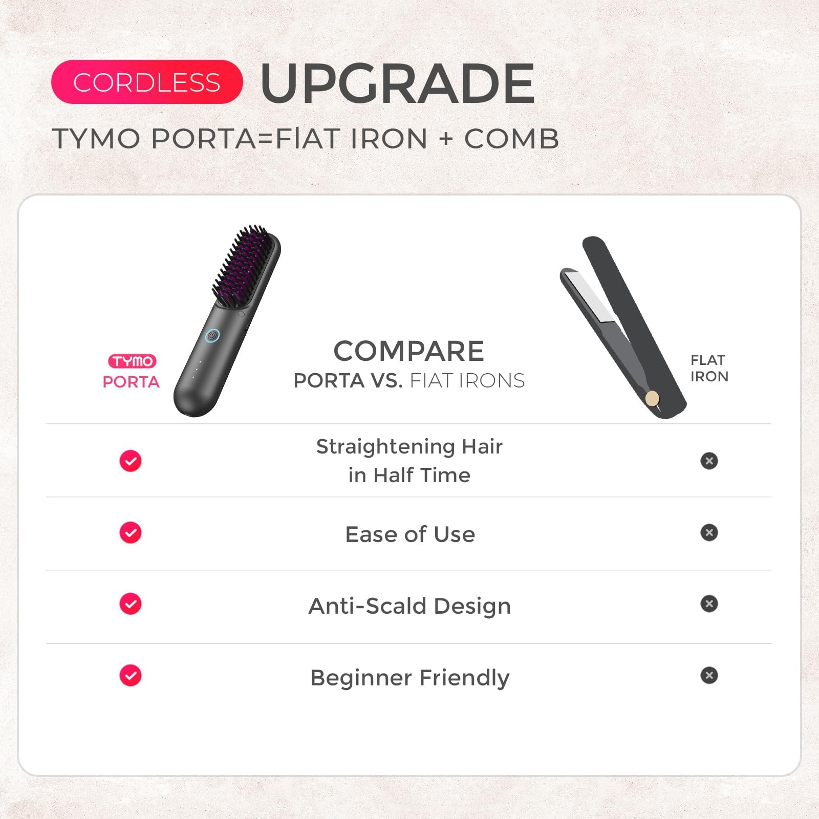 - TOUCH UPS ON-THE-GO: Please note: TYMO PORTA ECO is supplied without a charger. Weighing just 234g, cordless hair straightener brush is crafted for effortless use. Its compact size fits neatly into a purse. With cordless functionality, you can use PORTA ECO anywhere and perfect for daily touch-ups: pre-work, client meetings, post-exercise and so on, ensuring you maintain your best appearance at all times.
