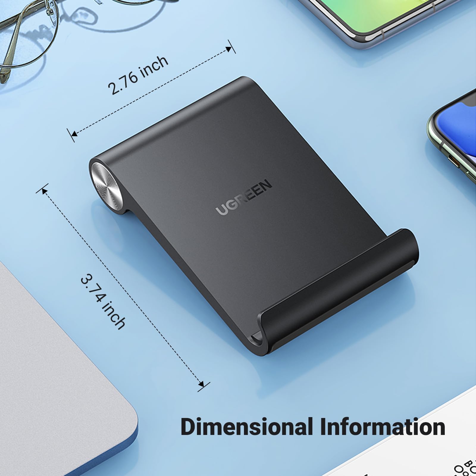 - Small and compact: Measuring just 2.83' by 3.74' by 0.75' and weighing only 14 oz, and is made of plastic, the phone stand is small and lightweight. The fully folding phone holder takes up little space on the desk and can easily slip into your pocket