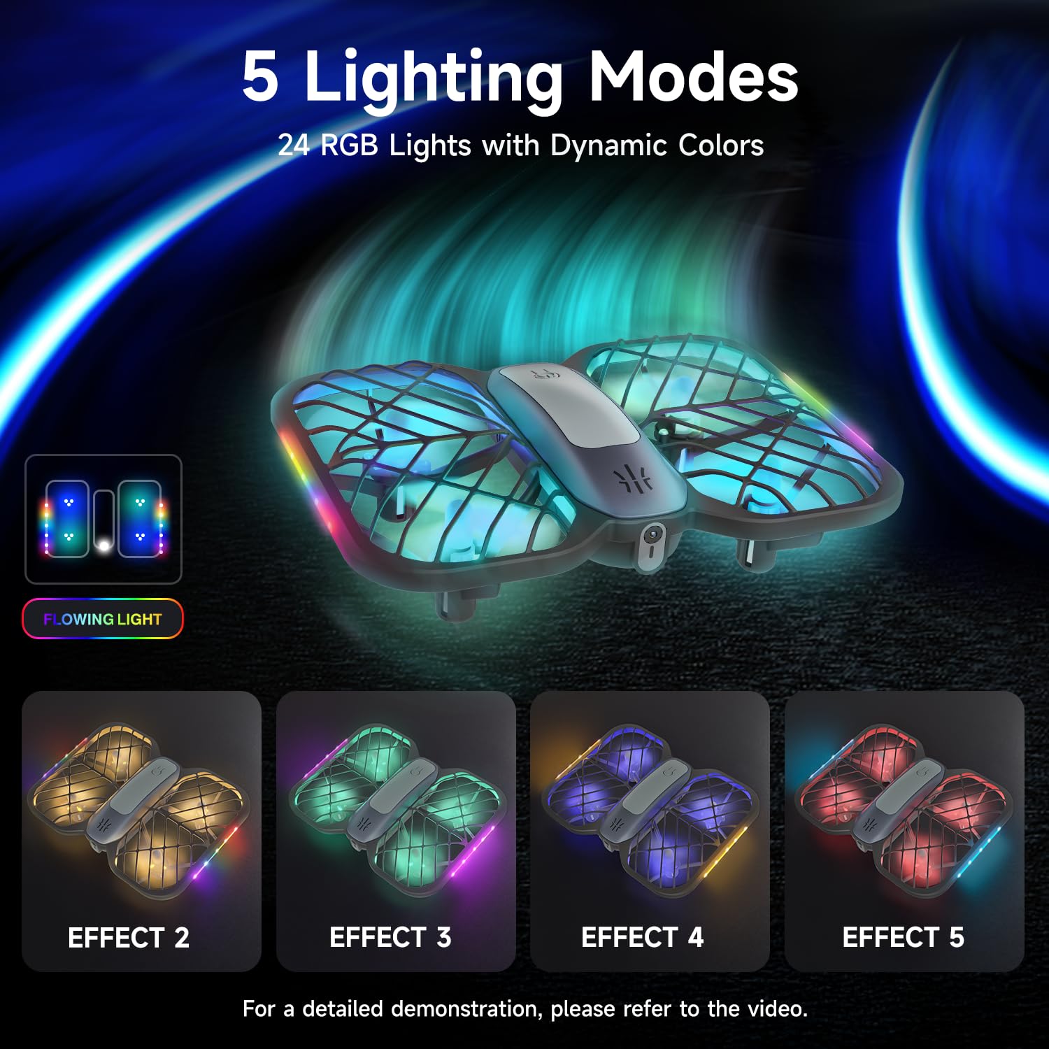 - VIBRANT RGB LIGHT EFFECTS: The Uranhub M10C drone for kids features 5 dynamic RGB light modes, delivering a mesmerizing visual display that lights up the night like shooting stars. These switchable lighting effects add excitement of nighttime flying, making every flight an unforgettable experience
