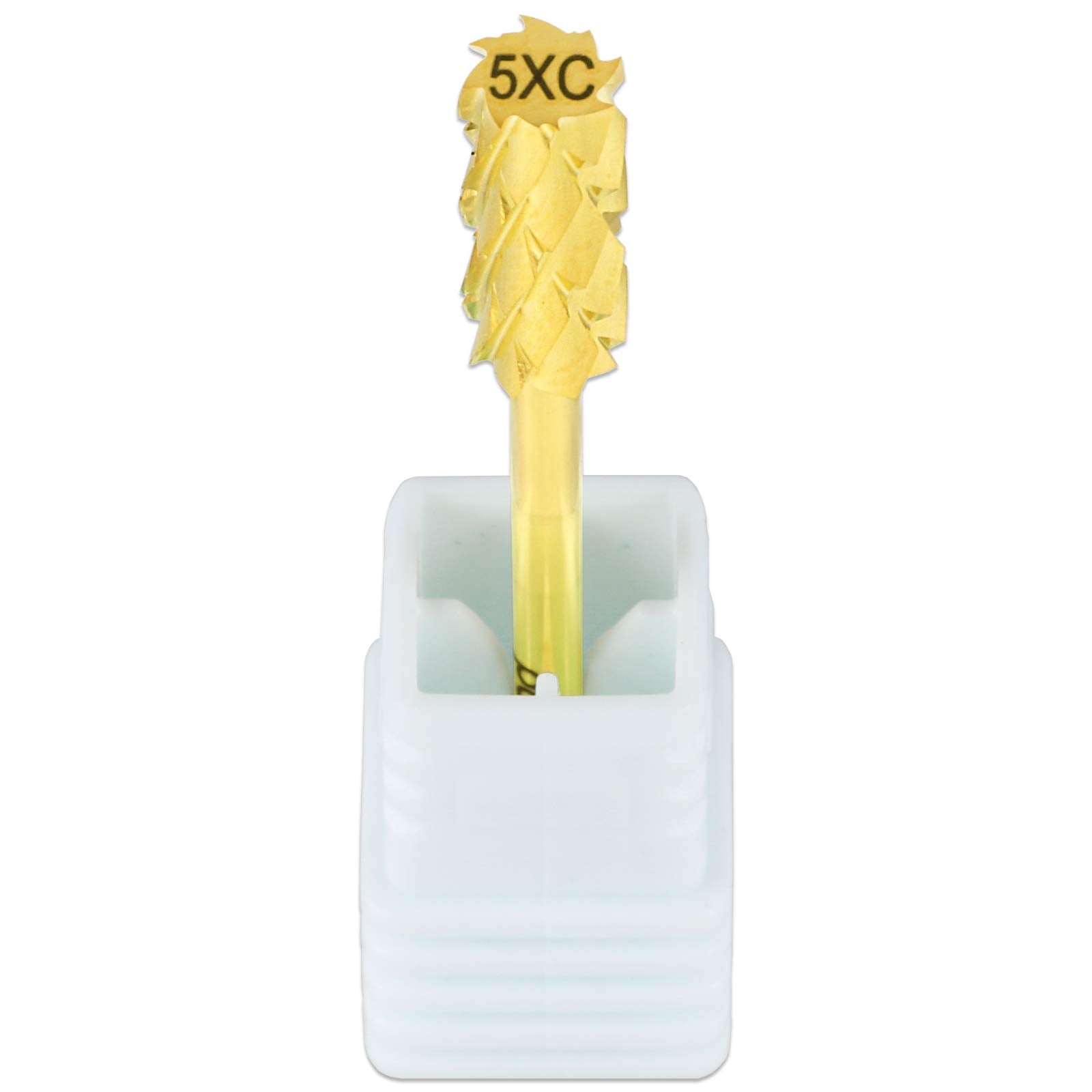 - Quantity: 1 Piece | Color: Gold | Grit: 5X Coarse | Size: 3/32” Shank | Design: Flat Top Small Barrel Carbide Bit